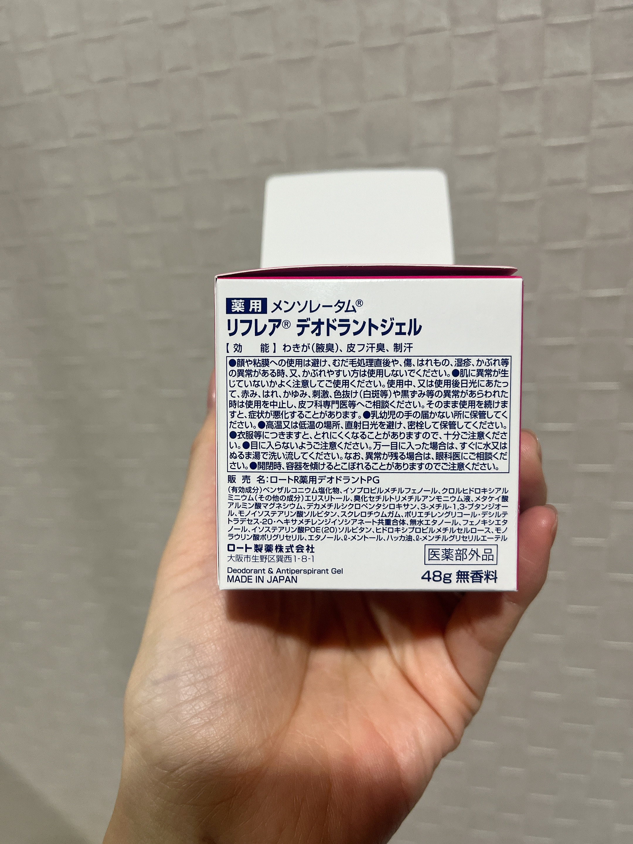 【脇汗NG💦✨】ロート製薬メンソレータムリフレアデオドラントジェル・商品説明 気になってしかたない「ワキのニオイ」。 「リフレア」シリーズは、Wの殺菌有効成分 ※1でニオイの原因菌をしっかり殺菌。気に なるワキのニオイをしっかり抑えることにこ だわりました。高密着持続処方。ワキガのニ オイも汗のニオイも、しっかりケアして24 時間快適。 「メンソレータムリフレアデオドラントジェ ル」は、スーッとさわやかな使用感のジェル タイプ。さらっと軽い使用感がお好みの方 に。たっぷり使えるジャータイプ。デオシー ルド※2配合で、べたつきにくく快適なわき へ。 “他の人より汗のニオイがきついと感じるこ とがある”“ワキガかもしれないと感じてい る”“汗で制汗剤が取れて、時間が経つとニ オってくる”“ニオイの気にならない生活を送 りたい”という方におすすめです。無香料。 わきの下など汗の出やすいところに、適量を 薄く塗布してください。 ※1:ベンザルコニウム塩化物、イソプロピ ルメチルフェノール※2:エリスリトール(湿潤剤)配合・感想 私は汗をかきやすくて、特に夏場は洋服の 汗染みに悩んでました。 そこでこの商品を試してみて、付けてるのと 付けてないのとでは全然違い、付けてる時は 汗染みが全然気にならないなと感じました 🥹🩵 こちらを使用してから夏場でもグレーのトッ プスもどうどうと着れるようになりました ✌🏻 使ってからお気に入りすぎて4年間くらいは 愛用してる夏の必需品です✨付けてると安心感が格段と上がりますし、異性の方とお泊まりする時とかにも私は使用してます!!なかなか減らずコスパもいいので脇汗が気になる方がいたらぜひ試してみてください🙋🏻♀️✨#ロート製薬#メンソレータムリフレアデオドラントジェル #制汗剤
