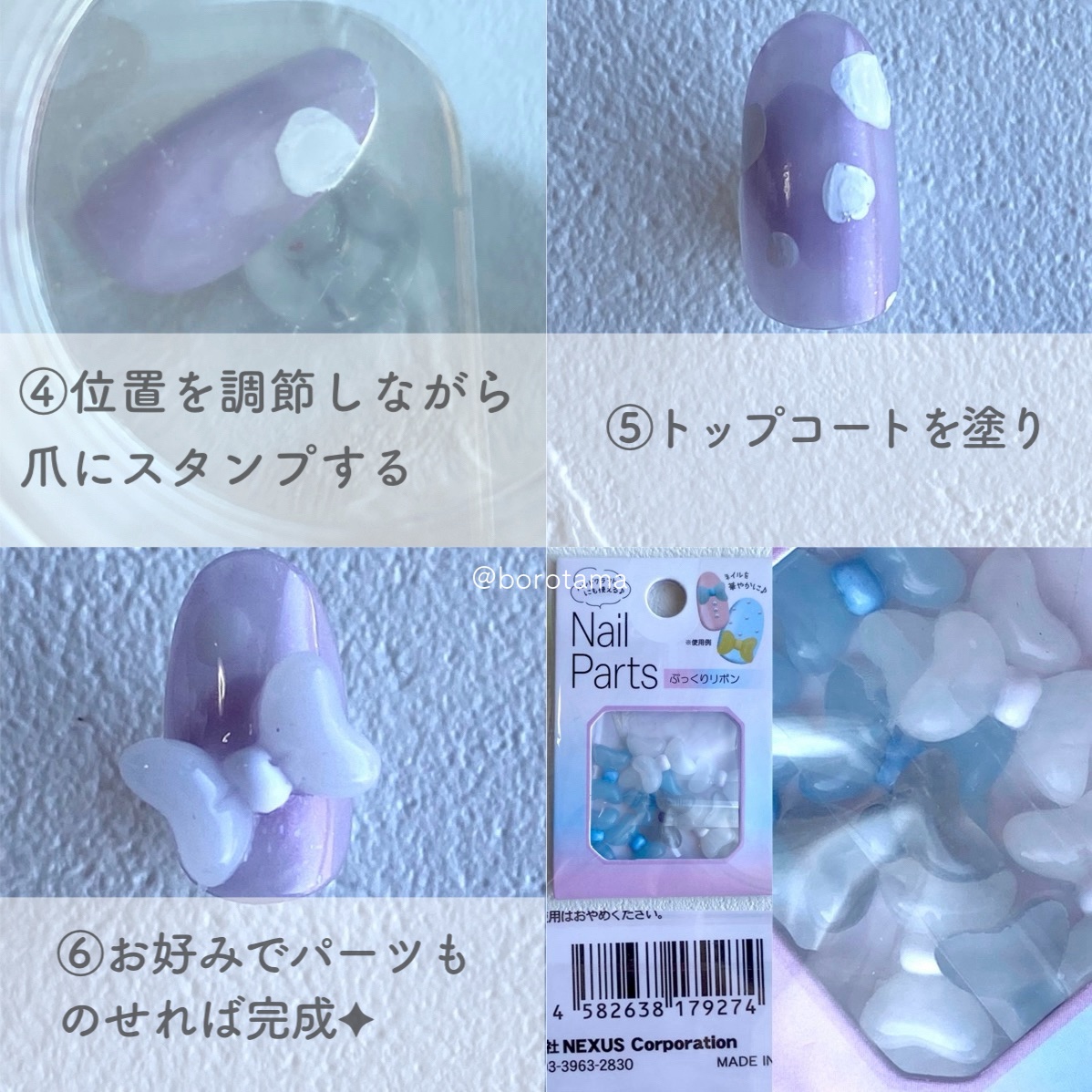 キャンドゥのパーツでリボンネイル🎀今日は先日紹介したネイルパーツを使ってネイルしてみました✦ピンクと組み合わせるか迷いましたがパープル×水玉が可愛かったので😉********************♡作ったもの♡♡#CANMAKE(#キャンメイク)396円(税込)#カラフルネイルズN96♡#キャンドゥ110円(税込)◆ネイルパーツぷっくりリボンJAN:4582638179274♡#Seria(#セリア)110円(税込)・フィックスグロッシートップコート・ネイルパーツクリアベア4PJAN:4580231114876♡その他・スタンパーネイルスタンプやフレンチネイルするときに買ってみた人も多いのでは?Seriaとかで購入したやつで大丈夫です🙌・白色のマニキュアもしくは乳白色のシアー系🔻白色は塗りムラになりやすいカラーなので塗るのが苦手な人は乳白色のシアー系のカラーの方が塗りやすいかと思います😉発色するまで何度か重ねてください🙏キャンメイクのカラフルネイルズN29あたりを私はよく使います🙌********************♡作り方♡①紫を2度重ね塗りししっかり乾かす②白色のマニキュアをスタンパーの柔らかい面にちょんとおく③クッキングシートなどに軽く押し付けて伸ばし④位置を調節しながら爪にスタンプする⑤トップコートを塗⑥お好みでパーツものせれば完成✦********************スタンプはシリコンシートの上などでやるともっとキレイな丸になりますが歪な感じも可愛い💗リボンいっぱいくっつけようか迷いましたがSeriaで買ってたクマちゃんも一緒にのせてみました🧸パーツで簡単に可愛くできるので100均で好きなデザインのアイテムを探してみてくださいね〜😊#ネイル#セルフネイル#100均ネイル#簡単ネイル#セルフネイル初心者#ネイルデザイン#ネイル記録#プチプラネイル#リボンネイル#nails