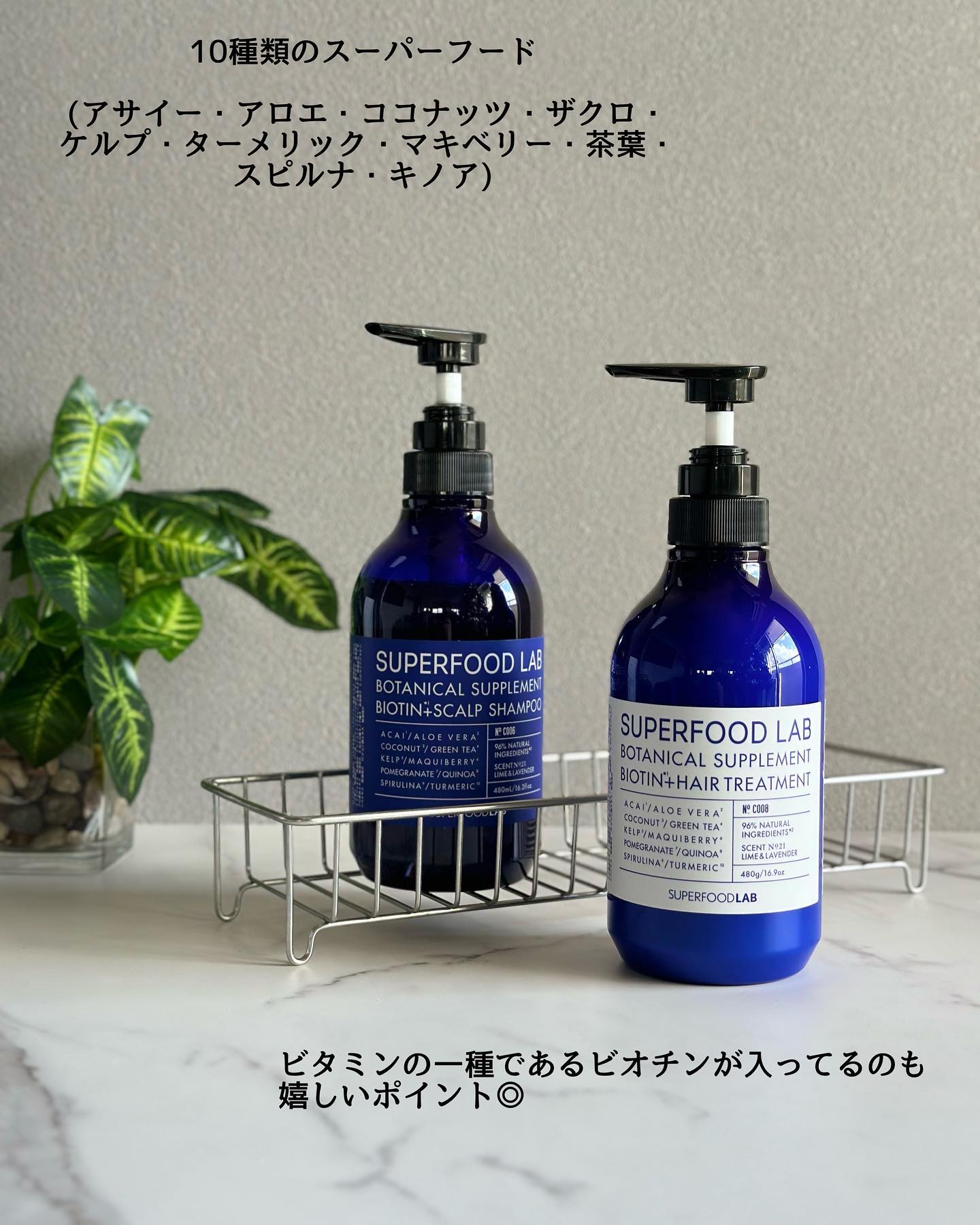 とっても素敵なシャンプー&トリートメントをご紹介させてください💜…SUPERFOODLABビオチン+スカルプシャンプー&トリートメント(480ml/480g)@superfood_lab…▶︎points☑️世界には約30~50種類のスーパーフードが存在します。その中から、頭皮や髪に良いと研究された素材を厳選し、サプリメントエッセンスとしてブレンドしたシャンプー&トリートメントです。☑️これまでの販売実績→日本や中国、香港、マレーシアでも販売され、累計138万個を達成!☑️アメリカの最新美容業界で注目されているビタミンB群の一種である成分「ビオチン」を配合☑️リフレッシュ効果のあるライムとリラックスできるラベンダーの香り🪻☑️6つのフリーを実現!合成着色料フリー動物由来原料フリーシリコンフリー(シャンプーのみ)パラベンフリーサルフェートフリーラウレスフリー▶︎review青いボトルも美しいシャンプー&トリートメント。ポンプをプッシュすると、とても素敵な香りがします。ライムとラベンダー、とのことですが私はラベンダーの香りを強めに感じました。すっごく良い香りに包まれながら、シャンプー&トリートメントをする時間は、至極の時間♡テクスチャーは両方とも、とろけるような感じです。ドライヤーするまでは「良い香り〜♡」がメインの感想だったのですが、ドライヤー後の髪の毛の手触りがとても良いと感じました。そして個人的に驚いたのが翌朝、ベッドでうとうとと髪の毛を触ったのですが、ツヤツヤな気がしました。久しぶりにこんな手触りになった気がします♡※あくまで個人の感想です※