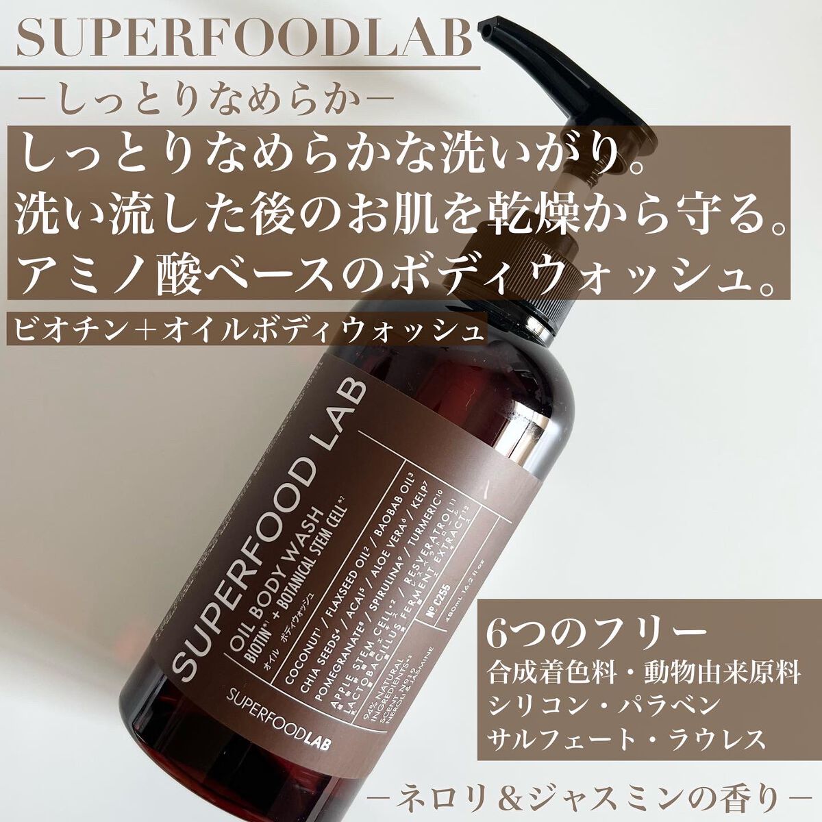 スーパーフードラボBT+オイルシャンプー香り✨ネロリ&ジャスミンの香りビオチンと4種のオイルを含む10種のスーパーフード自然由来成分配合。少し黄色かったかった色で、シャンプーは泡立ちがよかったです。シリコンパラベンサルフェートラウレス合成着色...