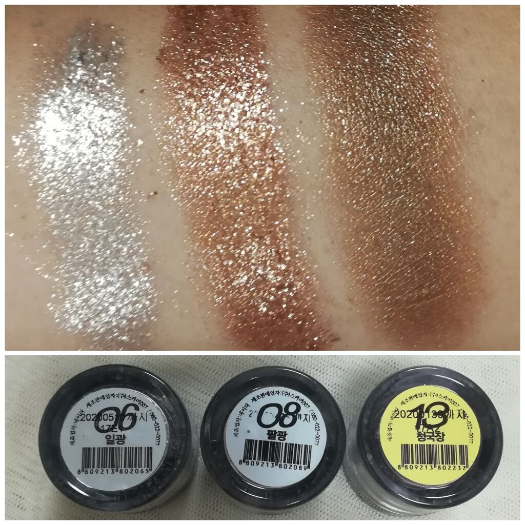 Qoo10で5色セット¥2000で売っていて、全10色買いました✨上から2.スパイシー味3.サワー味4.スウィート味5.ビター味6.日光7.月光10.雨光11.塩味噌12.甘味噌13.チョングッチャン韓国コスメはネーミングセンスが可愛いですねw発色もよく綺麗なラメ感ですごいおすすめです✨色味は動画があるのでそちらをご覧ください!!ただ、ラメが飛ぶので頬に付いてしまったりするので手でつけたら、すぐに手についているラメを落としてからメイクを続けたら問題ないです👍全色揃えたくなりますね!