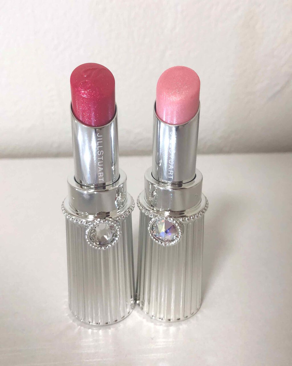JILLSTUARTリップブロッサム50dazzlingpoinsettia💖この色はしっかり色がついて、しかも細かいラメが沢山入ってるので、一本で仕上がり使いやすい商品だと思います💎色味は青みのあるピンクでハッキリした色です。JILLSTUARTのラメは結構唇でラメの感触がしちゃうので使用時は私の場合はリップフォンデュを付けて保護してから使っています。