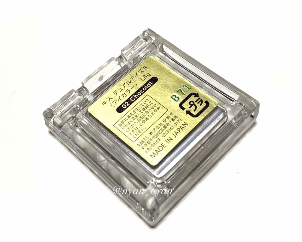 _____________________♢Kiss・デュアルアイズB02[chocolate]こちらはキスの新作の単色アイシャドウです!見た瞬間一目惚れ👀♡とにかくかわいい!!カラー展開が沢山あって色に悩んだけどやっぱり最初は無難なブラウン(笑)他にも赤系とか色々ありました!この色は薄い茶色と濃い茶色で、少し赤みがあるかな?という感じです!ラメが細かくて上品な感じ🤤💭これ一つでアイメイク完成できるからとても便利!!コンパクトで持ち運びもしやすいしこれはもう全色集めたくなっちゃう、、粉質はViseeのシングルアイカラーより、RIMMELのプリズムパウダーアイカラーの方が似ている気がする!少しパサパサした感じ☆良い点☆・コンパクト・カラー展開豊富・ラメ飛びしない・もち◎・発色〇☆悪い点☆・なし_____________________