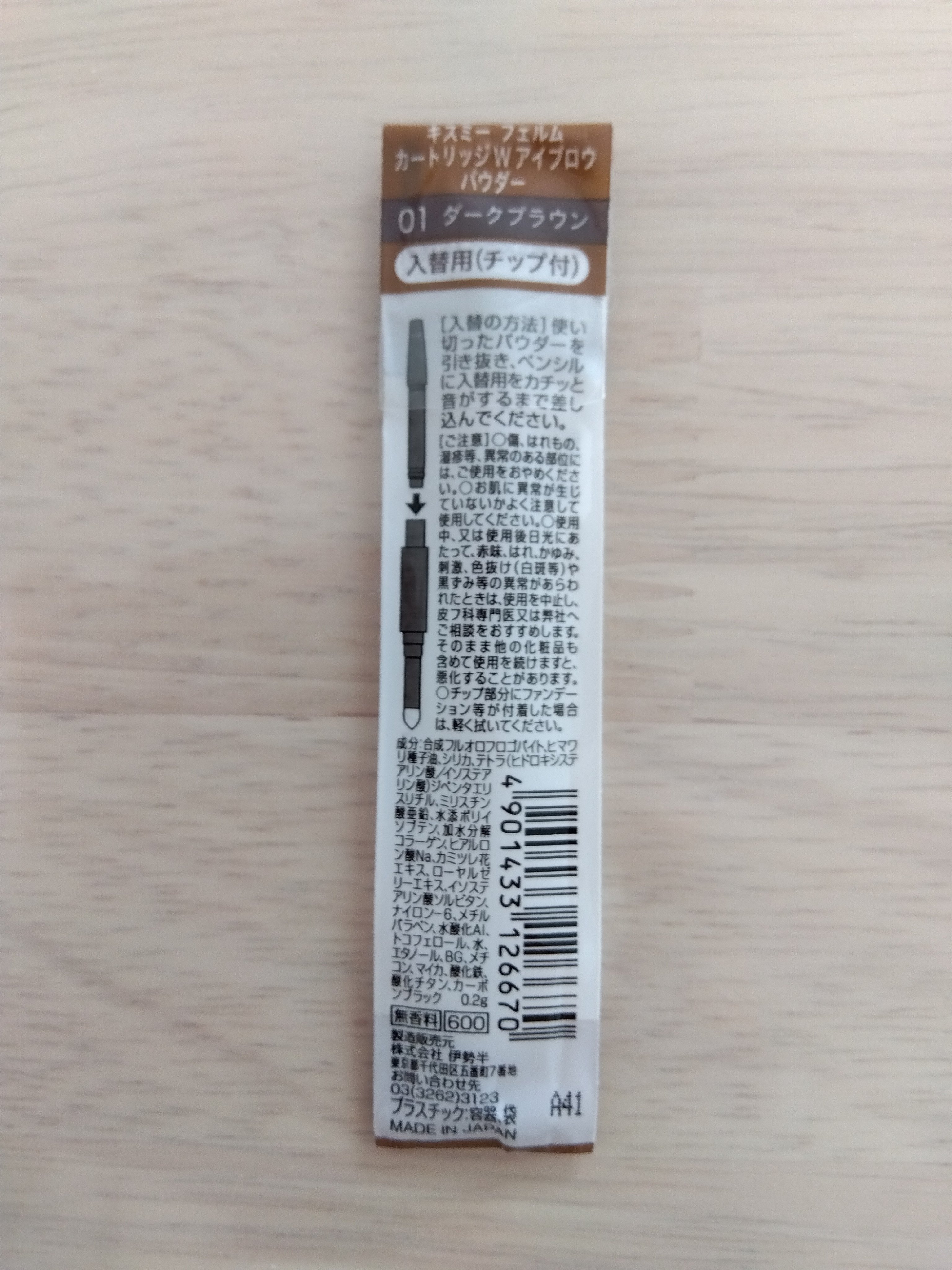 【キスミーフェルム カートリッジWアイブロウ】 01 ダークブラウン 本体 ¥1,210入替用パウダー ¥660以前はサナ ニューボーンのWブロウEXN(アイブロウペンシル&アイブロウパウダー)を使用していましたが、パウダーの方が先になくなってしまうのが不便で他に良い商品がないかとドラッグストアで探していたらこちらの商品を見つけました!カートリッジ式になっていて、それぞれなくなったら入替用を購入すればいいのでとても便利です☺️欲を言えば、サナ ニューボーンのアイブロウようにぼかす用のブラシも付いているとさらに良いですが私はブラシを使う為にサナ ニューボーンのアイブロウを取ってあるのでその点は今のところ解決しました。#キスミーフェルム #カートリッジWアイブロウ#01 ダークブラウン