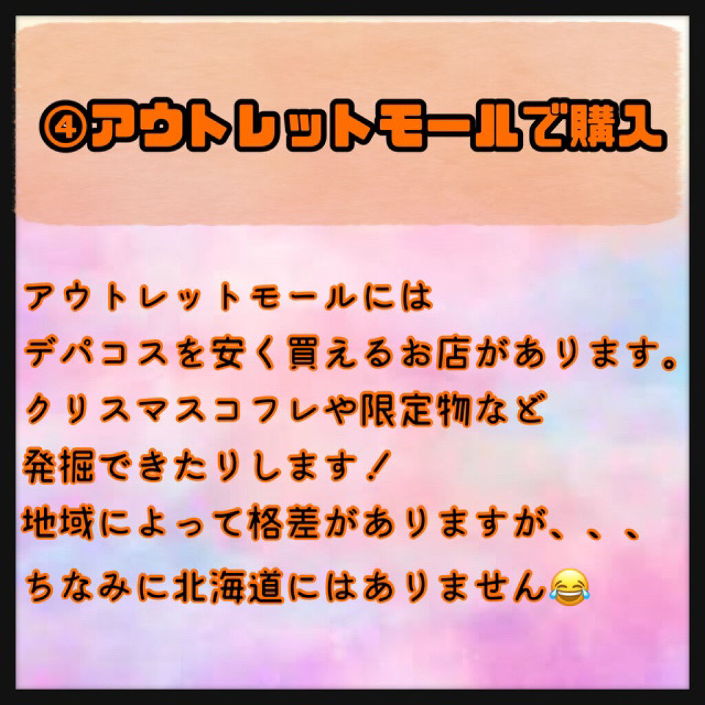 ⭐️必見?!デパコスを安く買う方法⭐️デパートのコスメたくさん買う人、もう少し安くなったらいいなーって思いませんか??私はいつも思います🥺今回はデパコスを安く買える方法を4つご紹介させていただきます。୨୧┈┈┈┈┈┈┈┈┈┈┈┈┈┈┈┈┈୨୧1️⃣百貨店の株を購入。もちろん株なのでリスクはあります。でもほとんどの百貨店でだいたい100株程度買うと株主優待として10%オフで百貨店の商品を購入できます。もちろんコスメも対象で(一部対象外もあるので詳しくは調べてください)購入金額によって上限もあります。例えば年間で30万化粧品買うとしたら3万安くなる、3万あればあれもこれも買えますよね🥺何度も言いますがリスクのあることなのでよく考えてからご購入おすすめします。私はリスクを背負ってでも価値あると思ってるので購入しています。2️⃣百貨店のカードをゴールドや外商カードにする1つめよりリスクはないですが年会費がかかります。大体のデパートで10%オフで買うことができるので仮に年会費1万円だったとしても年10万円コスメ買う人なら元取れちゃうんですよ。お好きな百貨店で全て買うようにするのがおすすめです。いつも行く百貨店を調べてみてください。3️⃣並行輸入品を買うネットなどで安く買えますよね。中には偽物や古い商品などもあるのであまりおすすめはできません。日本処方と成分違ったりもするみたいなので!それでも欲しい人はすごーく安く買えるので調べてみてください!4️⃣アウトレットで購入私はアウトレットが大好きです。テンション上がりまくりませんか?!あれもこれも!こんな安い!!!え?あの時買い忘れた限定物も?!なんて事も。思わぬ運命の出会いがあるかもです。ただどこの地域にもあるわけじゃないので行ける人が限られます。ちなみに昔北海道にの北広島に入ってたのですが10年くらい前にテンポがなくなってました😂୨୧┈┈┈┈┈┈┈┈┈┈┈┈┈┈┈┈┈୨୧その他にも百貨店友の会や安く売ってる店で買うなど様々な方法があるかと思います!少しでも参考になれば嬉しいです!