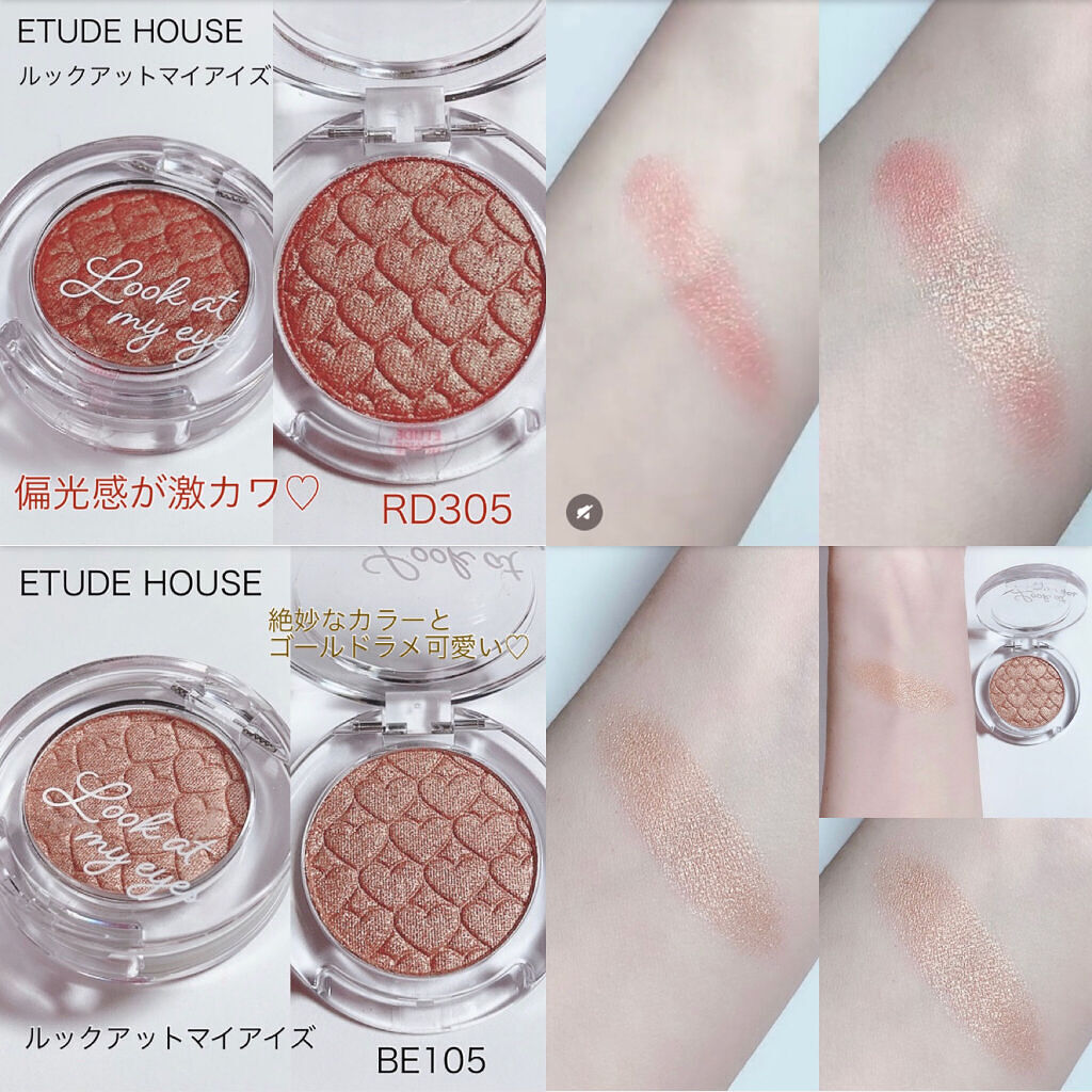 ミシャの方は、ツヤ感が綺麗で色味はかなり淡いアイシャドウです。ほのかにピンクみがある感じでかわいいです!アイホールと涙袋に塗りました。 エチュードの方は、マットシャドウで、濃くはないのでふんわり可愛らしく仕上がるところが気に入っています。プチプラですが粉質も良い(≧∇≦)b ピンクレッドみたいなカラーです。こちらも上下瞼に重ねました。 どちらも可愛いシャドウで気に入ってます♡