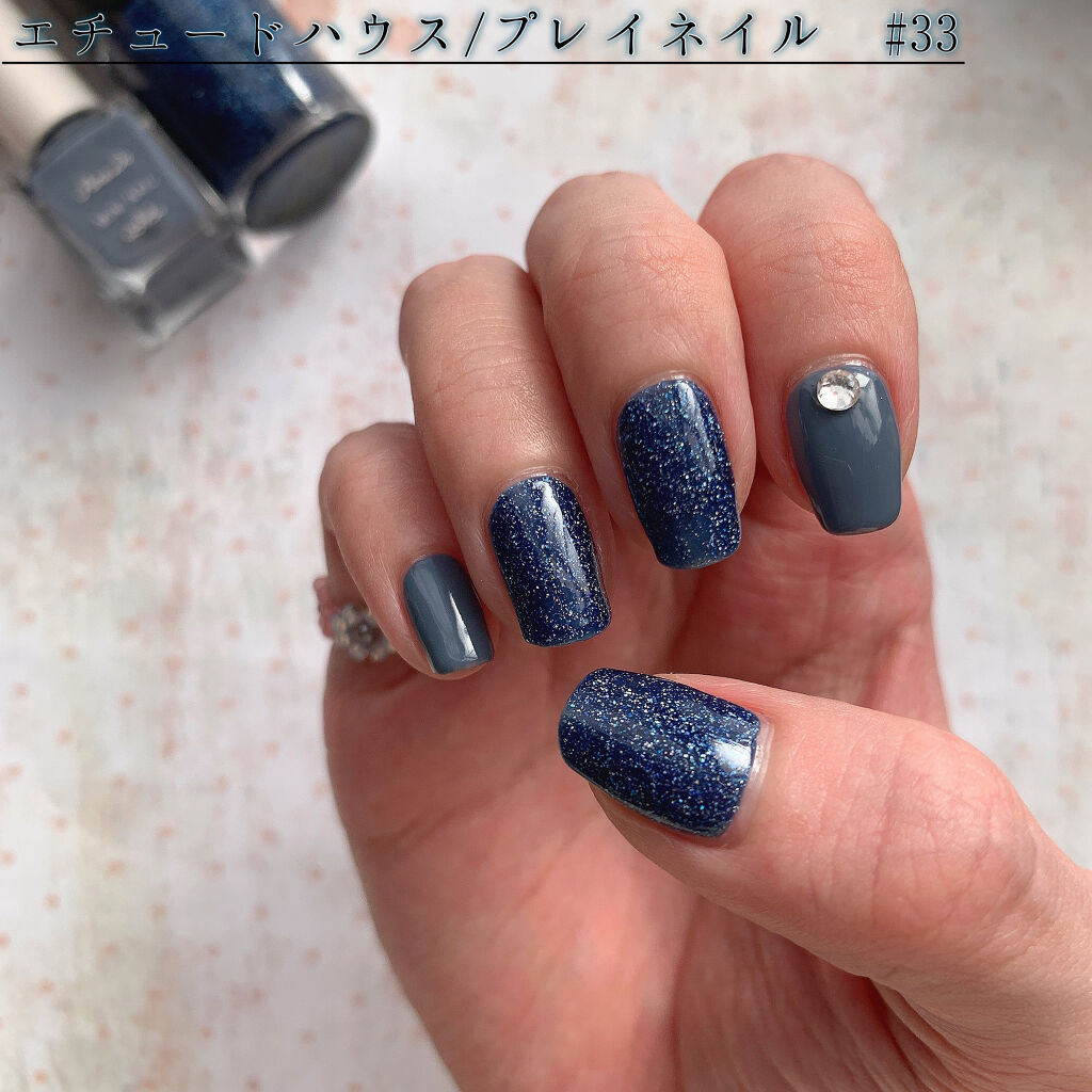 【幻想的でお洒落なカラー💫】★エチュードハウス プレイネイル #33 ¥363(税込) ネイビーカラーに多色ラメがぎっしり入ったクールでお洒落な色味です✨ シルバーラメが目立って、光に当たると多色ラメがキラッとするイメージ💫 少し派手な印...