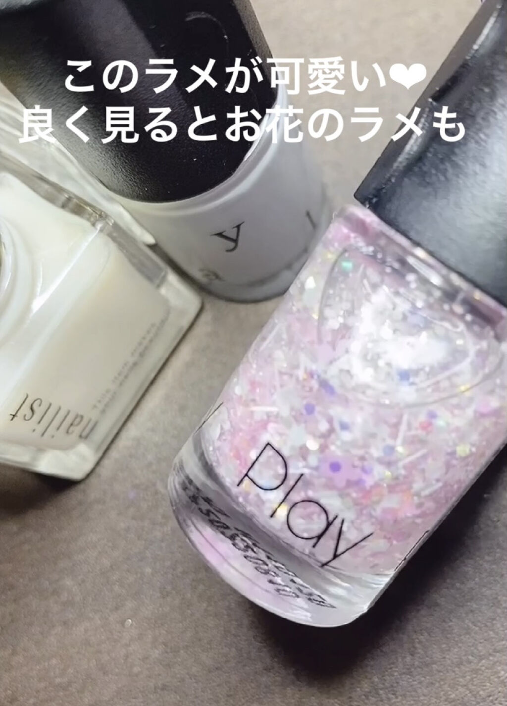 プレイネイルは初めて購入しましたが、まずパケが可愛い🥰💕 グレーのネイルはムラになりにくく、塗ると厚みが出ます💞たっぷり付ければ1度塗りでも大丈夫そう☺️ ラメは白やピンクの色んな形のらめが入ってます💕 良く見ると桜の様な花の形もありましたが、量が少ないので、ねらって取るのは難しそう💦 今回の購入品は両方とも可愛くて満足です😍