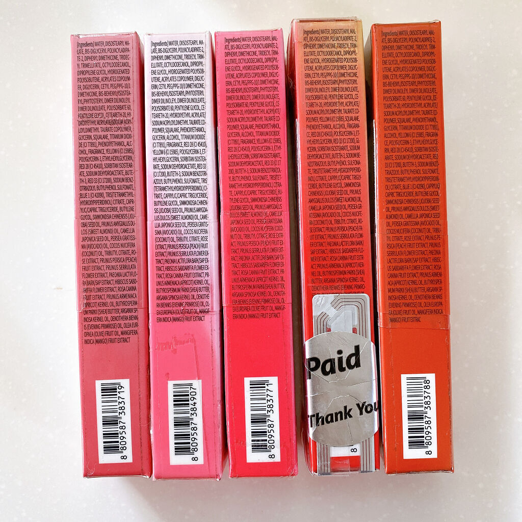 シャインシックリップラッカーのミニサイズ5本セット💘シャインシックリップラッカーミニサイズセットRD302レインボーボスOR201ジューシーフレッシュBE101ミスティーシルエットOR203ヴィンテージキャロットRD301ローズココミニサイズのリップ5本セット🐇💘LIPS内で検索してレビューを見てみたところ以前も販売していたようですが、私は12月1日に販売(再販?)されたときにエチュードハウス公式で買いました💕シャインシックリップラッカー自体は全部で10色あり、この5色はREDVELVETのメンバーそれぞれのお色だそうで、フォトカードが入ってました💡疎いもので、今回のカードで初めて拝見したのですが美しいです……😳💕🗒ささっと各色レビュー(色名などはすべて日本のエチュードハウス公式サイトからになります。)RD302レインボーボスティントにありがちな、ピンク転びしにくいはっきりとしたレッド🐇💕パキッと発色するのでしっかりリップを目立たせたいときや、グラデーションリップの時にもとても良さそうなお色です。写真だとライトのそばなので明るく写っているのですが、実際はもう少し深みのある赤です💡OR201ジューシーフレッシュボトルはわりとピンクっぽい色ですが中身はしっかりオレンジ🍊こちらもパキッとした印象の明るいオレンジ色で、ほんのりピンクみも感じます。コーラルっぽさもあるようなピンク混じりのオレンジカラーでした💘BE101ミスティーシルエット個人的に一番「可愛い」に寄ってるお色だと思います😳💕ベージュカラーですがわりとピンクっぽい印象。ヌーディーすぎない可愛いピンクベージュの唇になります💞💞OR203ヴィンテージキャロットOR201に比べてやや暗めのオレンジカラー。唇に塗ると手に出したときよりも赤みが強いかなぁと思いました。色の名前も201はフレッシュ、203はヴィンテージと付いてあるだけあって、しっかり印象の違うオレンジ色です🍊💕RD301ローズココ手に出すとややくすみ感の強い深みのあるお色🌹💕実際に塗ってみるとそこまでくすみ感が強すぎず、見た目よりも意外と手を出しやすいカラーです。こちらも写真はライトのせいでかなり明るいですが、もう少し暗めです🌠個人的にはお洒落さと可愛らしさを兼ね備えたお色だなーと思いました💓どのお色もしっかりツヤ感があり、色持ち、定着の具合がすっごくいいです😳💞実際に塗り少し時間を置いてからティッシュオフして、マスクで20分くらい歩きましたが、マスクに一切付いてなかったのでびっくりしました。唇にはしっかり色がついてるのに、真っ白なマスクは真っ白なまま😭💡「マジか……」と思って試しに手の甲にちょんちょんと唇を付けてみても全くつきませんでした🤔液は結構もったり。ウォーターティントはサラッサラで口に入りやすかったのですが、このテクスチャーだとそんなこともなく、潤いも閉じ込めてくれそうです。もったり感に反して伸びは良く、唇を擦り合わせるとゆっくりと広がっていく感じ。膜を張ったような、やや重ための秋冬にぴったりの仕上がりになります。べっとりとこの液を付けたままだともちろん他に付いてしまうのですが、色の定着が良いので時間をおく→ティッシュオフでめちゃくちゃ落ちにくいリップになるので、お直し出来ない時に役立ちます💫ティッシュオフするとツヤ感は落ちるものの、その場合は好きなグロスを足すので色々雰囲気も変えられて楽しいです💡💓オフしてサラサラにしてしまえばグロスのチップに色移りしにくい!っていうのも地味に、でも物凄くありがたい😭💓時間がないときはこれ一本でささっと塗っちゃえば落ちにくいツヤ感のあるリップメイクが完成するのでとっても便利です。 唇の画像が二つともライトのそばでとったので明るく写っているのですが、どちらも実際はもう少し暗めです😭💡ミニサイズは限定品なのでお早めに!💡💡#エチュードハウス#リップ#リップセット#ミニサイズ#ミニ#セット#ティント#限定#エチュード#LIPSOFFICIALUSER#RD302#レインボーボス#OR201#ジューシーフレッシュ#BE101#ミスティーシルエット#OR203#ヴィンテージキャロット#RD301#ローズココ