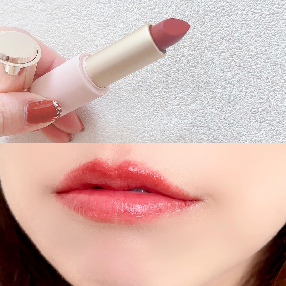 見た目も可愛いリップ💄✨ 中身はかなり深みのあるレッドブラウン?系で、冬にもピッタリ。 かなり発色いいのでひと塗りしただけで、はっきり唇に色がつきます。 テクスチャーは少し固めな感じかな🤔 大人っぽい仕上がりになります。 ティントとかではないのにかなり色が残ると思いました👍✨