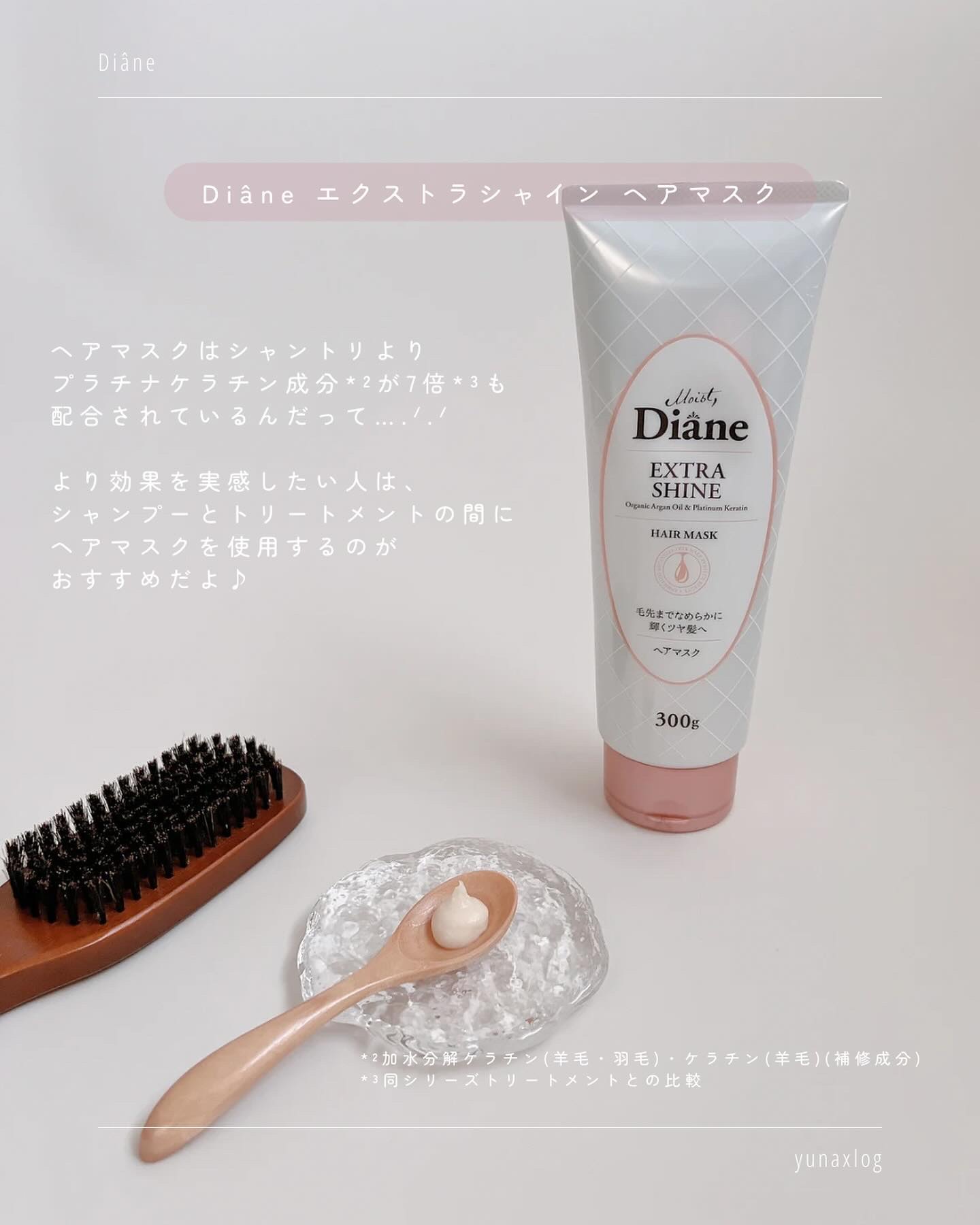 Dianeっていろんなシリーズが出てるよね。 この“白のダイアン”は、髪のパサつきが気になる人におすすめ。 プラチナケラチン⁎が髪の内側と表層を整えてくれて輝くツヤ髪に導いてくれるんです♡ シャンプーとトリートメントだけでも指通りが良い髪になるんだけど、ヘアマスクを間に使うと仕上がりが格段に違ってくる! ヘアマスクはシャントリよりプラチナケラチン成分が7倍も配合されてるんだそう。 仕上がりはふんわり軽い感じでペタッとした重みが苦手な方にも良さそう。 フローラルとベリーの華やかな香りもお気に入りです🫶