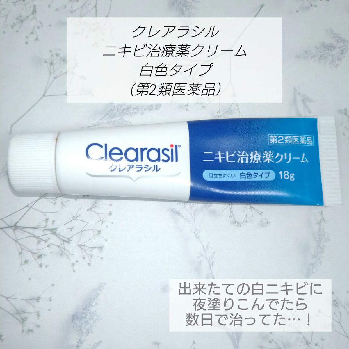 Clearasilニキビ治療クリーム 白色タイプ夜塗って寝ると朝にはかなり赤みが減っていた大きくなりかけてたニキビも小さくなった気がする塗ってしばらくすると目立たなくなってくる