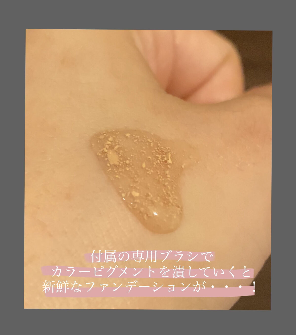 専用ブラシでクルクルするとつぶつぶファンデが弾けて色が出てくる面白さで他にはないワクワク感をくれる 軽くクルクルするだけでカラーピグメントが簡単に潰れるので力いらず🙅🏼♀️ 私にぴったりの真空ボトルなので長期間使用してなくても空気に触れてない綺麗なファンデが出てくるのも嬉しいポイント☝️ 薄ーい潤いのジェル膜で覆われて、みずみずしいツヤに包まれいる仕上がりに♪ 水分が75%も含んでるからムラや毛穴落ちしそうだなーと思っていましたがそれが全くないので感動もの!