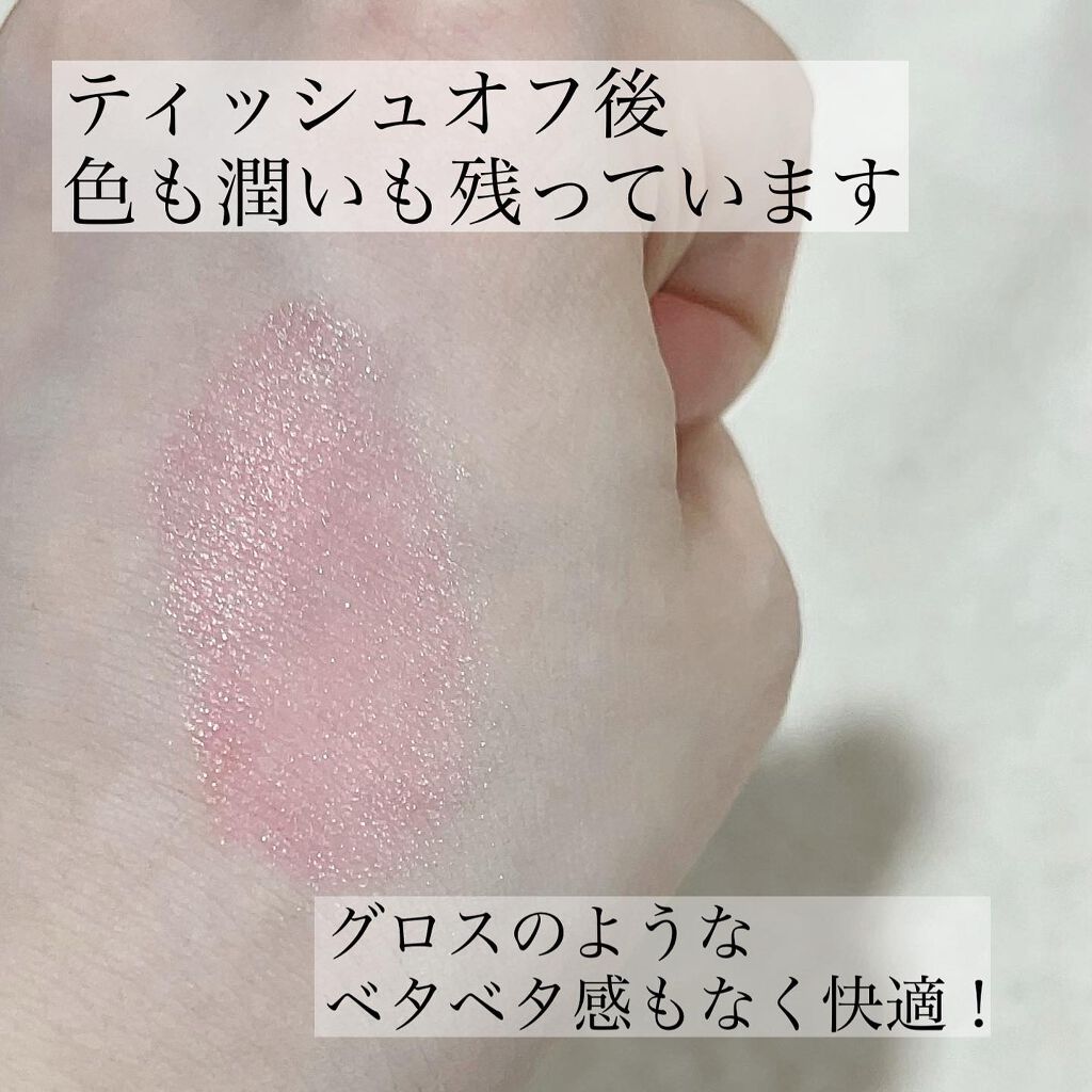 ラズベリーシードオイル配合で乾燥もしにくく、プルプルの唇にしてくれます。 何より気に入っているのは自然に血色の良い唇にしてくれること❣️ クリア系のリップなので、マスクへ付いてもほとんど目立たず使いやすいです! ティント特有の蛍光っぽい発色もなく、繊細なラメがとても可愛いです❤️