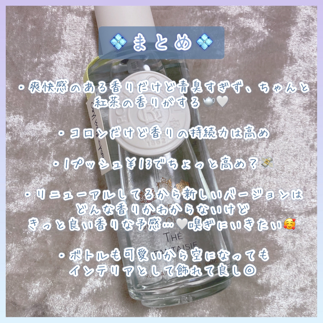 ┈┈┈┈┈┈┈┈┈┈┈┈┈┈┈┈┈┈┈┈🔖ロジェ・ガレ ┗エクストレド コロン テ ファンタジー100mL/¥9,020(税込) ※現在はオパフュメテに リニューアルされているみたいです。 ┈┈┈┈┈┈┈┈┈┈┈┈┈┈┈┈┈┈┈┈【商品の特徴】♦︎SNSで紅茶の香り🫖って大バズりしてた香水♦︎信じられないほどの爽快感、素晴らしい持続性と奥行きを兼ね備えた光輝く香りのコロン♦︎厳選されたシトラスとセイロンティ、サンダルウッドやベンゾインの神秘的なウッディ、ベチバーやシピオルのアーシーな植物の香りが複雑に絡み合いへディオンによって幻想的にたゆたう。♦︎時を忘れさせるファンタジーなフレグランス【肌質】・混合肌寄りの普通肌【使用感】・フローラル×紅茶🥀🫖♡・ふわっと爽快感のある紅茶の香り🫖・レディースだけじゃなくメンズとしても使えそうな香り・お茶の中でも紅茶感が強い・レモンっぽい爽やかな香りもする🍋・コロンだけど香りの持続力良い◎【イマイチなところ】・お値段が高い💸・取扱店が家の近くにない【使い方】・手の甲に吹きかける※擦らない【リピありなし判定】・あり〜🤎テファンタジーも通販では買えるみたいやね☪︎⋆┈┈┈┈┈┈┈┈┈┈┈┈┈┈┈┈𖤐˒˒*💎2025.4.21追記५✍🏻´-・オ パフュメ テの匂いかげた!!!💜たまたまデパートのコスメ売り場に行ったら店員さんに「どんな香りが好きですか?」って話しかけられて、「紅茶とかお茶系の香りが好きです」って言ったら「こちらの香りはどうですか?」って持ってきてくれた!香りはほぼテファンタジーと変わらなくて少し紅茶感薄くなったかな?紅茶感が薄くなって爽快感が増した感じ。だけどテファンタジー好きだったら好きな系統の香りやと思う。🫖使い切ったらオパフュメテを買おうかな✌🏻
