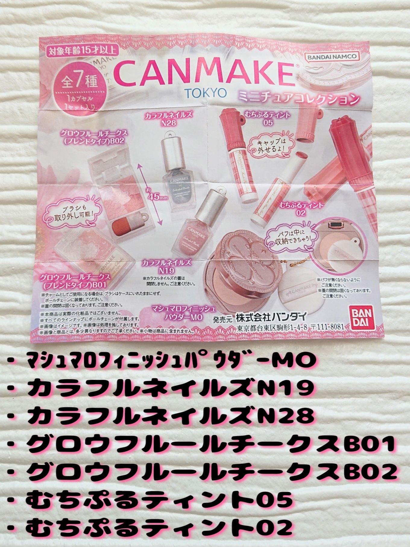 ずっと、すっと探してて、やっと見つけたCANMAKETOKYOミニチュアコレクション✨大人気ガチャガチャ!【セット内容】・マシュマロフィニッシュパウダーMO・カラフルネイルズN19・カラフルネイルズN28・グロウフルールチークス(ブレンドタイプ)B01・グロウフルールチークス(ブレンドタイプ)B02・むちぷるティント05・むちぷるティント02私が当たったのはカラフルネイルズN28スモーキーアクア💙現品愛用してたから嬉しい♪スモーキーなグレーブルーで夏の終わりから秋にかけて使いたい大人カラーです😌
