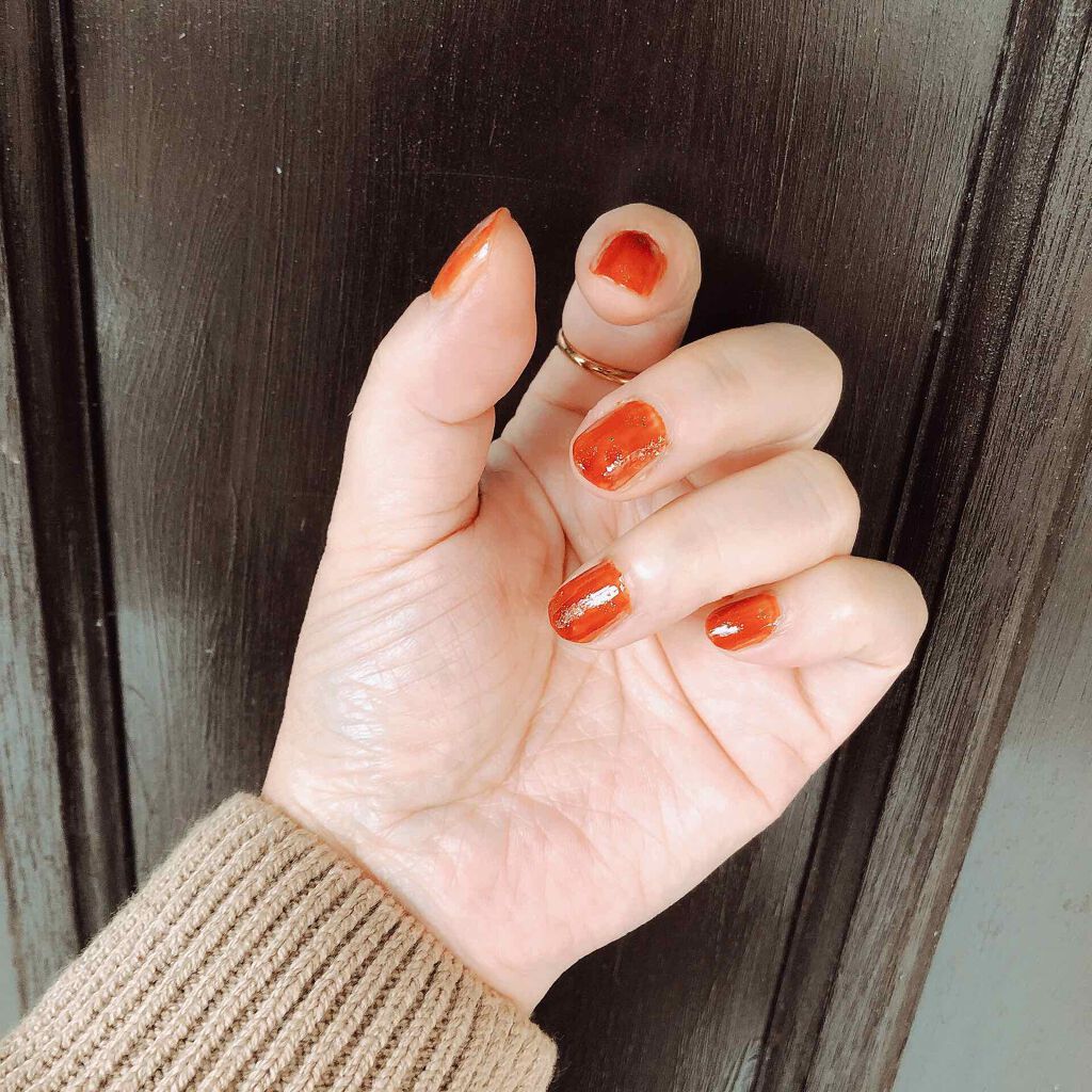 RMK EX-43 レッドクレイ 1度塗り→1度塗りでしっかり発色!秋色ブラウンオレンジが本当にオシャレで素敵なカラーです。気に入りすぎて出番が多いです。人差し指と小指だけ、キャンメイクのスパークリングゴールドのラメを乗せました。ゴールドカラ...
