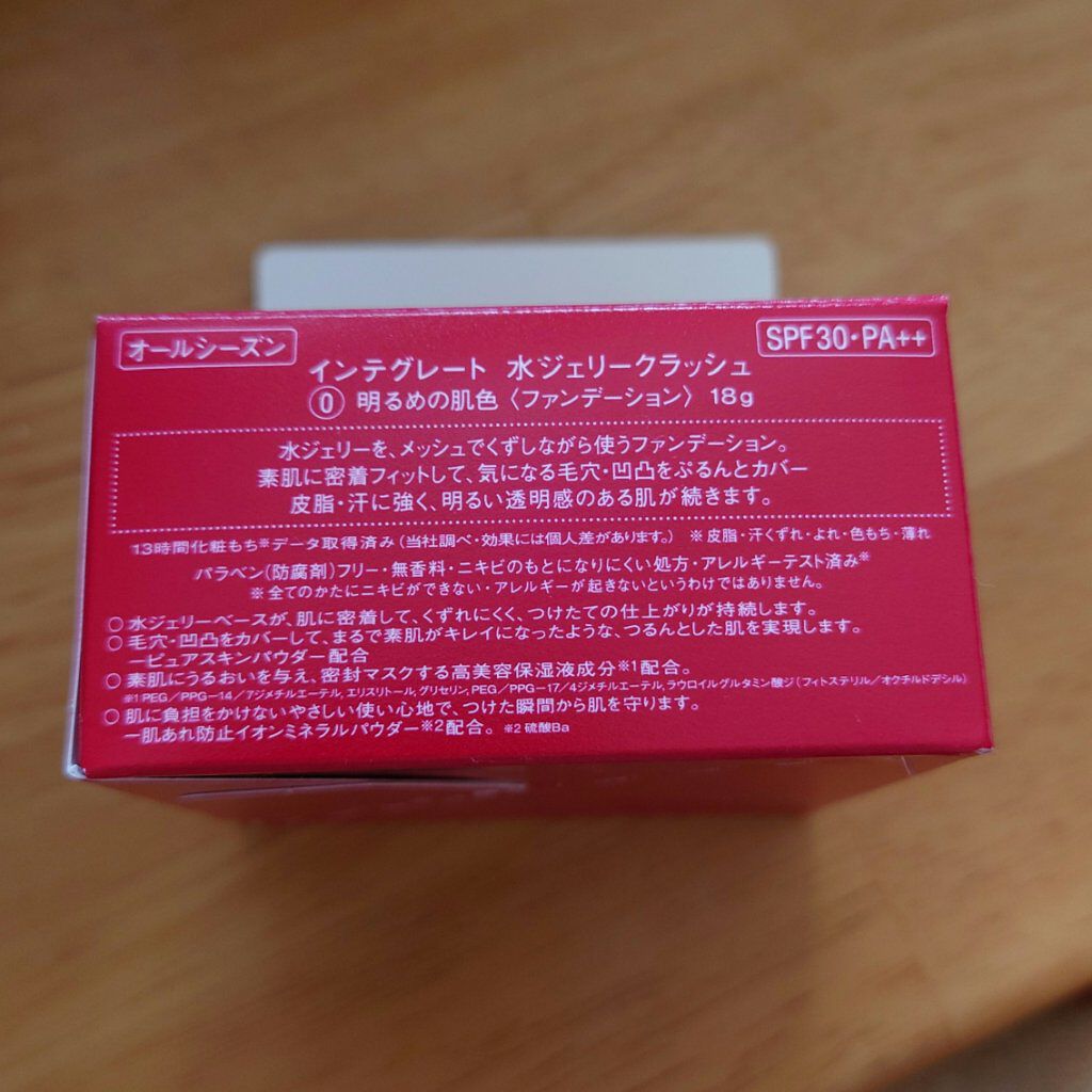 インテグレート水ジェリークラッシュ0明るめの肌色カラバリが多めなので合わせやすいかもしれない。ジェリーはそんなに柔らかくない。塗るとサラッとして密着します。...