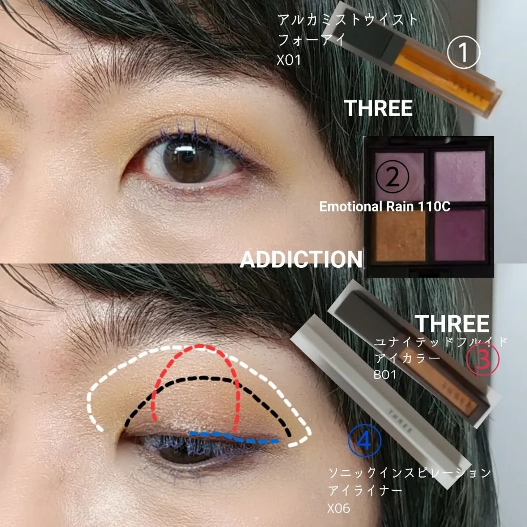 #今日のメイク今日は先日THREEでメイクして貰ったアイメイクを再現してメイク。手持ちのアイシャドウで何とかなりそうだったので今回はアイシャドウはTHREEのユナイテッドフルイドアイカラーB01だけ購入しました。イエロー系を乗せたあとにパープルを乗せると違和感が無いというのが新発見。なるほどなるほと。そして先にマスカラを塗る。THREEでは3回同じ色味を乗せてもらいました。さ、3回もマスカラって乗せるんだと勉強になりました。3回はアイメイク前に1回目、アイメイク途中で2回目、アイメイク終了後に3回目でした。✔️①から④の手順でメイクしました。①上瞼全体に指で乗せます。②上瞼全体に指で乗せます。③上瞼中央に指で乗せます。④上瞼キワに描きます。✔️リップはTHREE。#THREE#ADDICTION#SUQQU#BOBBIBROWN#一重メイク#デパコス