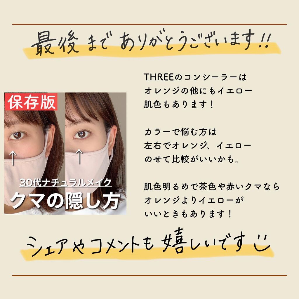 備忘録THREEアドバンスドスムージングコンシーラーOR税込3,850円天然由来成分80%のリキッドコンシーラー。8種の植物オイルや植物エッセンスの恵みが、やさしくトリートメントするように肌の悩みをカバーします。(公式引用)リモート時の画面に映った自分の顔のクマが目立っていたのでクマ用に購入(7月上旬頃)青か黒クマと思っていてBAさんが青クマだとおっしゃったので青クマに良いというオレンジ買った。カチカチ回して液体を出して使う筆タイプのコンシーラー1番最初は20回ぐらいカチカチ回さないときけない(恐る恐る回してた)────────────・塗りやすい・青、黒クマに使える。・目元、口元のくすみ、鼻横に使える。・ORはニキビ跡とかには向かない。・オレンジ!って感じではなくオレンジが混ざったようなベージュ・塗り過ぎなければヨレない・RMKのやつよりは液体少し硬め(RMKの方がゆるい)・寝かすよりペン先を下にして保管した方がいい気はした────────────使い方自分の場合主に目頭の下側にクマがあるから(特に右)その辺にちょんとのせて、指で馴染ませていく(スポンジじゃなくて指!)毎回3回ぐらいカチカチ回すって言ってた、出過ぎたら手の甲にワンクッション置いてから使う。めっちゃクマを消したい時は更に上から手持ちのベージュコンシーラーを重ねる(少しずつ)安定のやつ#three#three_コンシーラー#アドバンスド_スムージング_コンシーラー