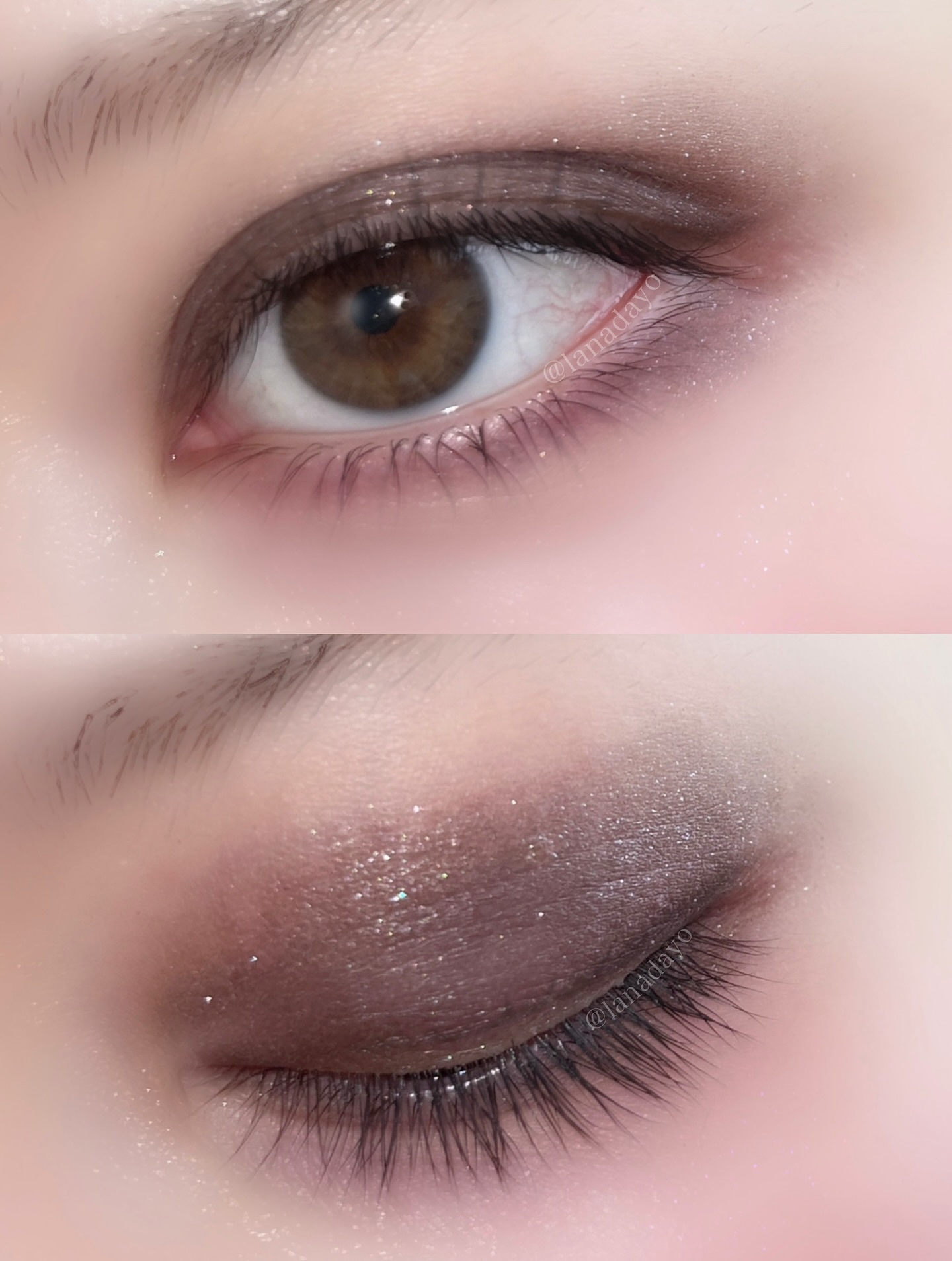 KATEザアイカラー024ダークブラウンなんですが、少し濃いグレーっぽい感じ???スモーキーなメイクに🦋私は、童顔なので大人っぽくしたいときとかはこんなスモーキーなアイシャドウを使ってます🥰グリッターがとても可愛いんですっ🥺🥺#スウォッチ...