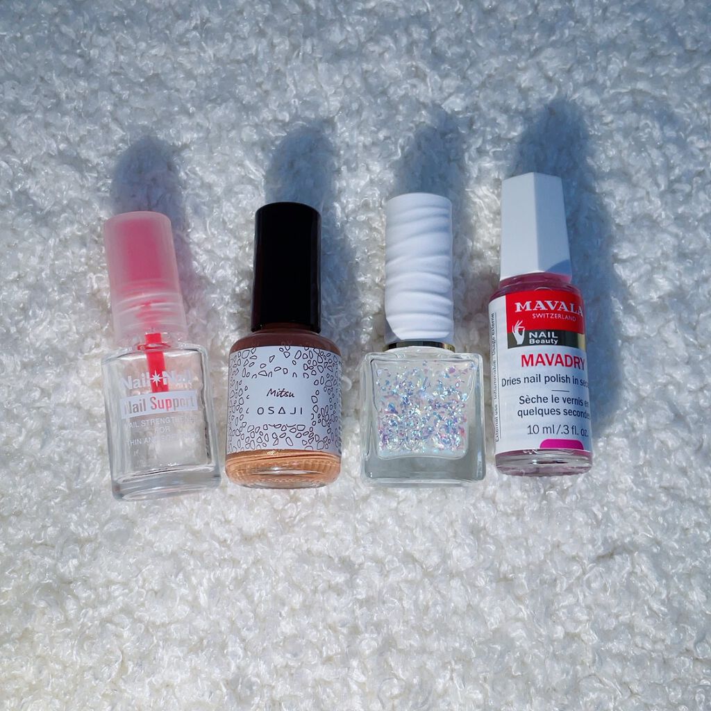 OSAJI『蜜』を2度塗り とにかく塗りやすい✨ 特に2度塗りだとムラなく綺麗に塗れます! 1度塗りの方が肌なじみは良い気がしました。 ブルベの方にも使いやすいブラウンだと思います🙌🏻 細かいラメがたくさん入っていて美しい❣️ 透明のベースにホログラムざくざく🌟 濃いめのカラーに乗せるとホロが目立ってかわいい🙆♀️ ホロが筆につきにくくてもうちょっとたくさん入ってればなぁと思ったので悩んでマイナス1。 でもかわいいので次は別の違う筆を使ってもっとぎっしり乗せてみたいと思います😙