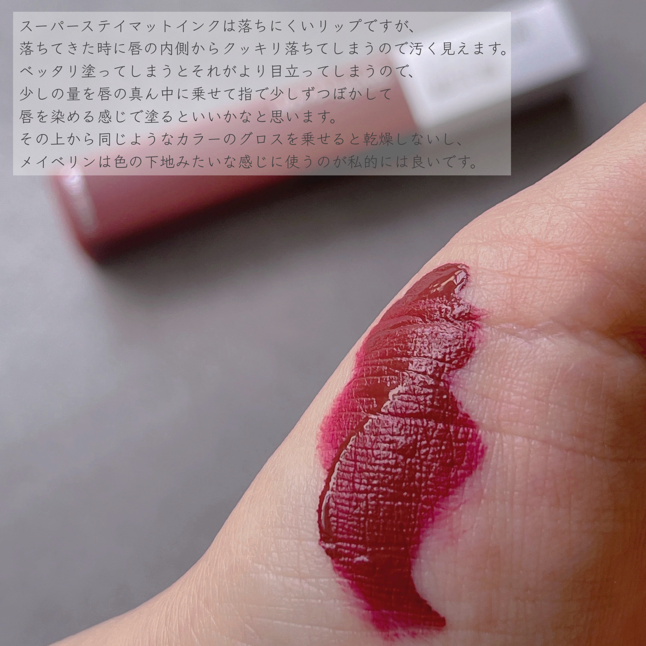 ⋈︎MAYBELLINENEWYORKSPステイマットインク50VOYAGERスウォッチ最近、深いレッドブラウンやボルドー系のリップにハマっているので店頭で見つけて購入してみました☺︎☻︎ SPステイマットインクは使いこなすのが難しくて最近は使ってなかったんですがカラーが可愛くて買っちゃいました基本的に落ちにくいリップなんですがどうしても飲食したり擦れたりすると唇の内側の方から色落ちしちゃってそれがすごく汚く見えちゃうんですベッタリ多めに塗るとそれが顕著になってしまうので、まずチップに付いたリップを出来るだけこそいで少なくして唇の真ん中にチョンチョンと付けてから指でポンポン広げて唇を染めるみたいに塗るのが1番良いのかなと思いました全部チップで塗るのはきついかな。これだけだと乾燥するので上に同じようなカラーか透明のグロスを塗って仕上げます同系列のカラーを使うとより馴染んで良いと思います唇の血色を上げる下地みたいな感覚で使うのがいいかなこれを塗ると顔の印象がハッキリして色白に見えるんです指で塗ると指に着いちゃうんですけどハンドソープで洗えば綺麗に落ちます色が可愛すぎるので何とか色々駆使しながら使っていきたいと思います(・̫・)#まりかメイベリン