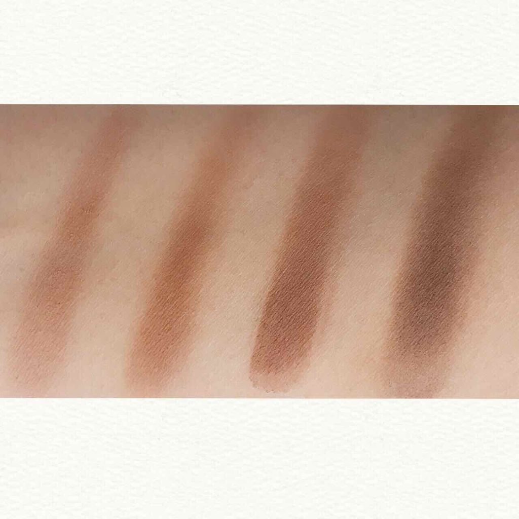 真ん中のラベンダーが綺麗な色です! 派手になりすぎず、地味にもならない、まぶたを明るくしてくれる絶妙な色。 淡いベージュ系カラーをまぶた全体に塗ることで肌馴染みもよくなります。 今日はアイライン代わりに右から2番目の赤みのあるブラウンを使用しました。 柔らかい粉質なのでブラシで取ると崩れてホロホロに… 1色の幅が細いので指では取りにくいし、隣の色まで取ってしまうことも… 扱いは慎重に…