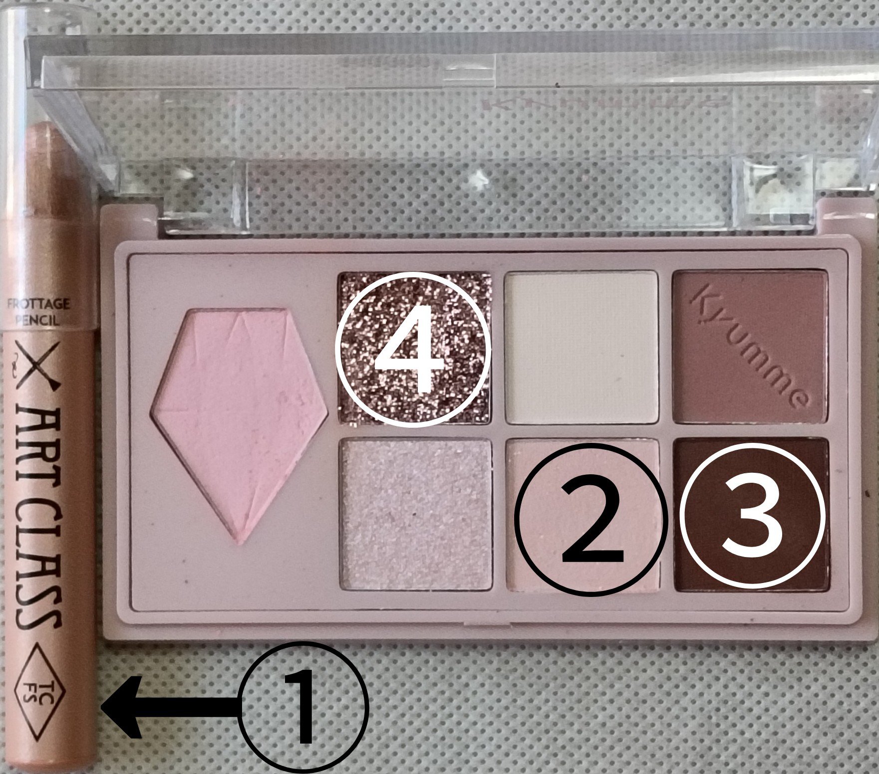 アリィー クロノビューティ ミルクUV EX 上下左右によく振ってから顔全体に塗布する。 Kyumme マルチパーパスパレット アイシャドウの中のチークを両頬に濃いめにのせる。 MAYBELLINE NEW YORK スカイハイ 01 ブラック まつ毛全体にたっぷり塗布する。