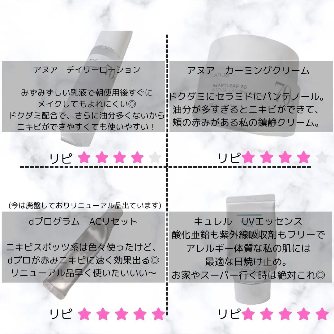 🐏30代ゆらぎ・赤み・混合肌🐏💆♀7月の使い切りスキンケア💆♀★★★★★→絶対リピ★★★★☆→リピしたい★★★☆☆→リピは迷うなあ8月は引き続きニキビ・赤みケアに紫外線ケア・美白ケア・抗酸化ケア忘れない〜紫外線やエアコン疲れで、乾燥や毛穴開きも気になってくるから、毛穴ケアもしていきたい🥺🫡🤍#使い切りスキンケア#赤み#ニキビ#ゆらぎ#アレルギー#混合肌#化粧水#乳液#クリーム#美容液#セラミド#ドクダミ#パンテノール#アルビオン#dプログラム#アヌア#キュレル