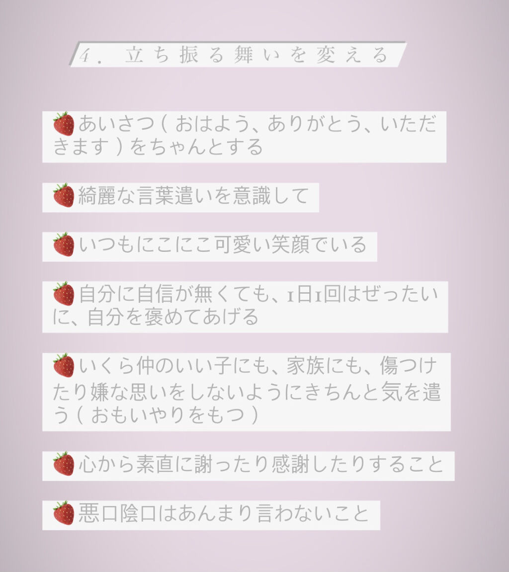 夏休み垢抜け大作戦❕こんにちは、くれあです🐑♡長い夏休みも後半にさしかかろうとしていますがみなさん自分磨きは順調ですか❔😌私は旅行に行ったり、遊びに行ったりそういう時に気が抜けがち、、でも垢抜けしたい、!これから垢抜けのためにできることを紹介するので見てください🤍┈┈┈┈┈┈┈┈┈┈1.スタイルを良くする1番の垢抜けポイントはダイエット☁️食事を調整すること筋トレを朝晩すること血糖値を緩やかな上昇にするために豆乳を食前に飲むことお菓子はなるべく食べないように、、🪞2.スキンケアの徹底スキンケアはいつもより丁寧にボディケアも日々きちんと𓂃𓈒𓏸໒꒱ビタミンを含む食材の摂取綺麗な手でさわること週に2、3回パックもすることパックはとりあえずつけちゃおうスタイルですがおすすめは、、☁️MISSHA.ピュアソースポケットマスク☁️メディヒール.ビタライトビーム☁️我的美麗日記.黒真珠🪞3.ヘアケアの徹底専用のオイルをコテの前に付けることお風呂前はブラッシングすることタオルでふく時は優しくぽんぽん家で結ぶ時はゴムではなくクリップにするオイルをドライヤー前後にわけてつけること〈やや細め太さ普通の私のおすすめオイル〉☁️ルシードエル☁️ミジャンセン☁️&honey☁️ウルリス🪞4.立ち振る舞いを変えるきちんとあいさつすること素直にごめんっていえること思いやりを持って行動することにこにこ笑顔でいること悪口陰口言わないこと𓂃𓈒𓏸໒꒱当たり前だけど、時々忘れてしまうことを忘れないことが大切だと思っています🪞5.+α夏休み、後悔しないためにも早寝早起きしてみたり朝活してみたり会う化粧品を探してみたり勉強もちゃんとやったりして頑張りましょう、、🐇♡┈┈┈┈┈┈┈┈┈┈最後まで見て下さりありがとうございました🤍、💬、follow+してくれたら嬉しいです🥰#垢抜け#夏休み垢抜け#夏休み_ダイエット#夏休み明け#可愛い#学年一可愛い#学年一モテる#ダイエット#ヘアケア#スキンケア#スタイルが良くなる方法#高校生#中学生#小学生#パックで美肌
