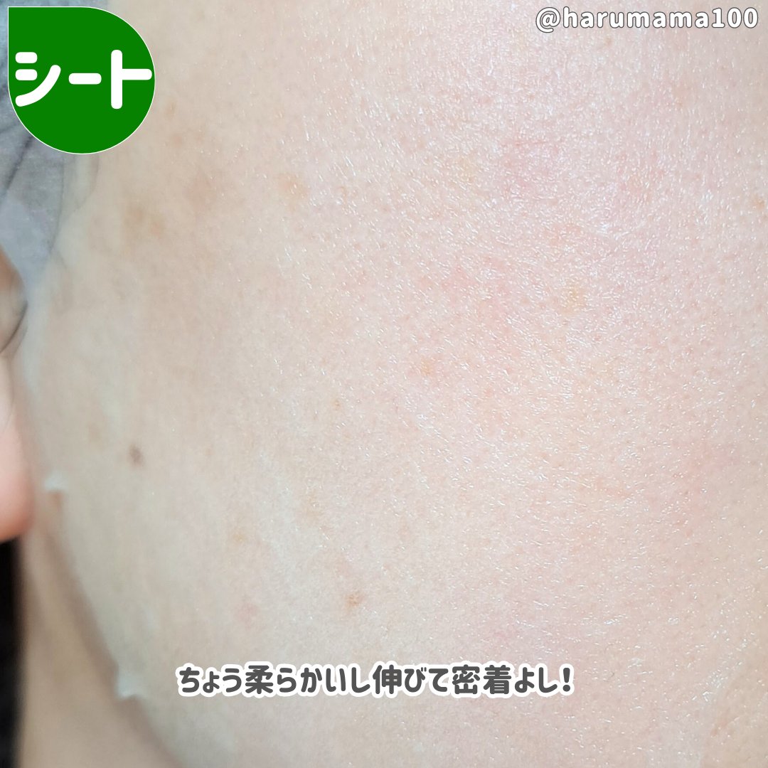 シートは少し薄手で、とっっても柔らかくてふわふわしてる❣ 密着感も好きな感じ! 柔らかすぎてくちゃっとなると貼りづらくなるから気をつけてるよ〜🙆 エキスのとろみは少なめだけど、シャバシャバってほどではないかな。 あっさり系でヴェール感も少なめ。私はお出かけメイク前にも使えてるよ🫠 グリーンティ系の香りは感じなかったよー。