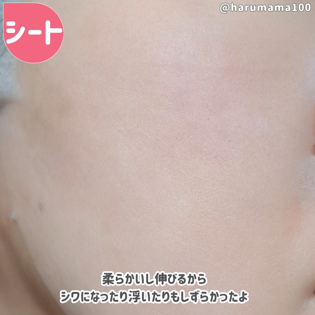 ホワッと柔らかめのシート。やや伸びもしてくれるけど、柔らかいから伸ばさずに貼っても浮いたりシワになったりもしにくいと思ったよ。 密着感があってズレ落ちにくいところも良い〜🫶 エキスたっぷりでこぼしまくったよー😂もったいないね!!! しかも軽めでベタつきにくいから、体に塗ってもヌルヌルにならなくて💮 あっさり系でヴェール感も少なめだからかデイリーや昼間ケアにも良いね🫶