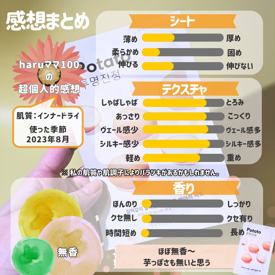 ジャガイモでスキンケア!?🥔MISSHAのシートマスク使ってみた。■MISSHA エアリーシートマスク(ポテト)私の中でジャガイモはビタミンCが豊富っていうイメージなので、朝のスキンケアに使ってみた。乳液系のエキスでびっくりしちゃった😂😂デンプン質なこととか考えると妥当なのかしら。匂いもイモっぽさは特になし。ほんのりスッキリした香りがあるけど、まったく気にしないで使える。化粧水で整えた肌に15〜20分貼ります。シートはエキスのおかげもあってか肌当たりが柔らかくて、貼り心地が良い。個人的には好みの使用感🫶水分補給というよりは、栄養を入れて蓋するマスクに感じた。インナードライ肌の人は貼る前にしっかり水分入れておいたほうが良いかもしれない……蓋はされたけど内側の水分がちょっと足りてないという体感🤔あと、水分系の美容液を使うならマスクを貼る前のほうがいいかも。乳液使った後って感じの肌になる。#もち肌スキンケア