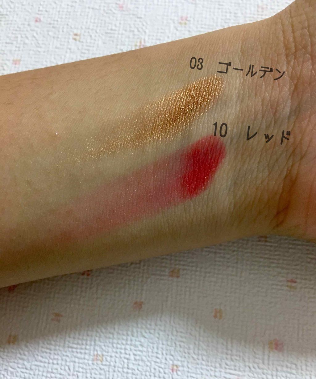 🇪🇬エンジェルハートアイカラー🇪🇪03ゴールデン・10レッド🇪🇨単色のパウダーアイシャドウ🇺🇾全16色🇺🇿300円📌Good2つとも言葉に表せないぐらい発色がいいです!特にレッドー!!1日付けてて全く落ちませんでした🤩色々なラメがちらほらと入ってます🌟♡とにかく安さに惹かれてしまいました😱❤️どっちかだけって言う人は迷わず…ゴールデンを押します✋🏻💋ほんっとに可愛いしラメがザクザク!どんなメイクでも多分対応出来ると思いますよ👏🏻迷ったら買っちゃってください☺︎☻📌Badあまりにも高発色なのでつけすぎには注意してください!ドンキホーテにしか売ってないんです、、私の家の近くにはなくて…ほんと残念です😫😫