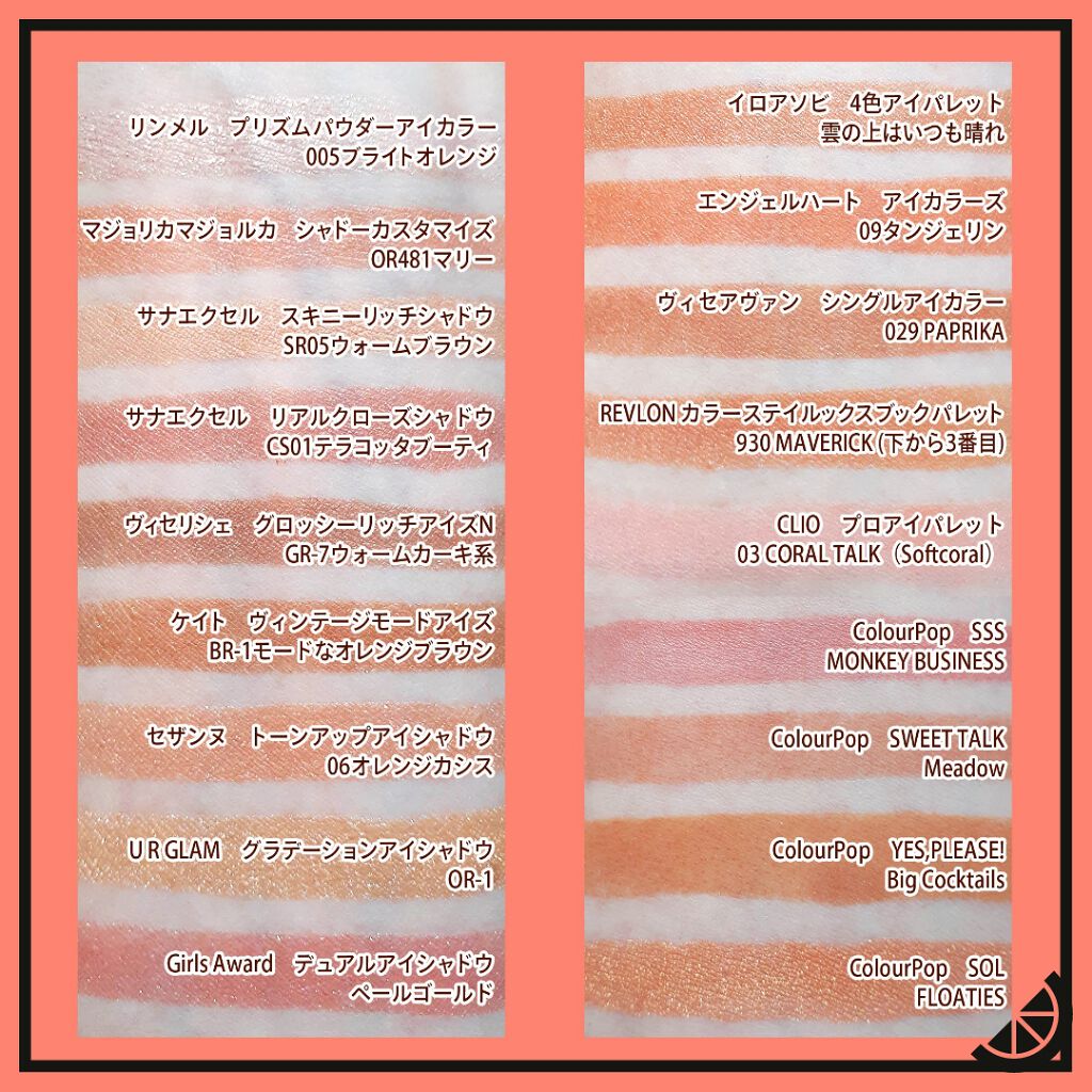プチプラでオレンジっぽいのがあるとつい買ってしまうので、把握のために塗ってみました。オレンジっぽくしよ〜と思った時になんとなく手に取る色たち。見た目と塗った色味の感じが結構違うので、塗る度に「あっこうだったっけ」ってなるのをこれで把握できた…はず。特に気に入った色を商品リンクにしました。・エンジェルハートアイカラーズ09タンジェリン・見た目からしてオレンジ!って感じで期待を裏切らない・ColourPopシャドーパレットSOL・夏といえばSOL・KATEヴィンテージモードアイズBR-1・オレンジ系にしたくて迷ったらこれを使う鉄板・GirlsAwardデュアルアイシャドウペールゴールド・キャンドゥの2色アイシャドウ塗ると赤みが強いけど、これはこれで好き