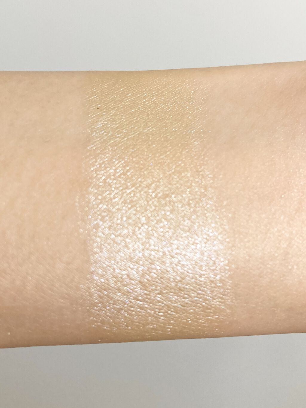 塗ってみると、黄色というよりハイライトっぽいツヤっとした白さが目立つ! 色味的にはイエベ春🌸さんかブルベ夏🌻さん向き! つけてみてイエベ秋🍁向きじゃないなと思ってあまり使っていませんでしたが、これからいろんなカラーと重ねてみたいと思います!👍