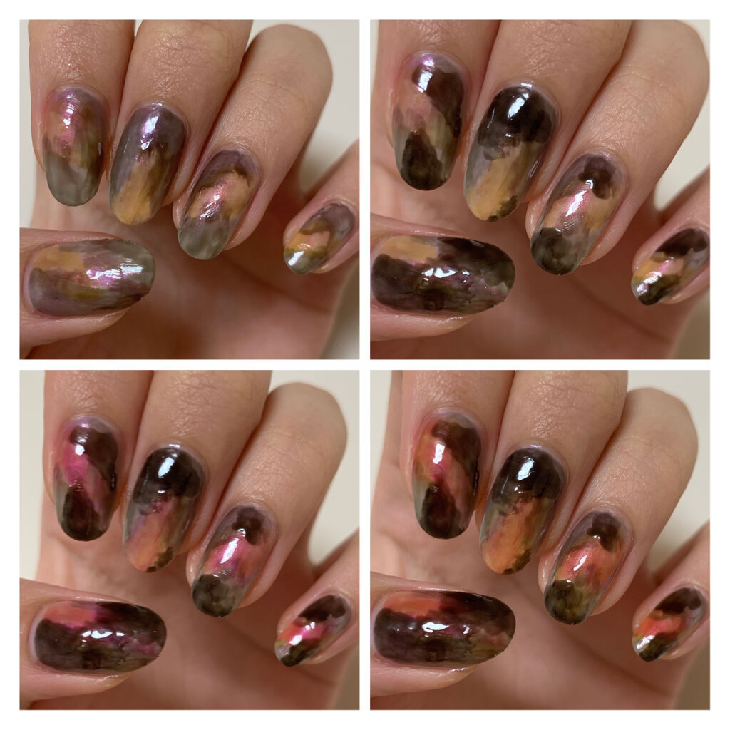 秋っぽいネイルがしたくて重ねていくだけの紅葉の季節カラーで塗りかけを作って、ニュアンス風に💕 くすみを両側に入れると、わたし的に、すごくまとまりが良くてお洒落に見えるなー😍なんて盛り上がってました笑 ポイントは濃いめオレンジのパール。今回はスキューズミー、グロッシーコートマジョリカオレンジを使ったんだけどこのカラーがないと、雰囲気がでないし締まらないかな。と思った! 似たようなカラーがあれば誰でもできるので、あまり考えずに重ねて塗りかけたら、オレンジで締めて、オレンジみのあるラメを散らせば何となく綺麗です🤣👍👍 他の色と混ざった部分が綺麗なので乾かないうちに、塗っていくのが良いかと思う✨💕