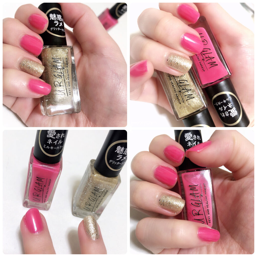 【見たまま発色ネイル💅❤︎これで100円は衝撃的!!】⬛︎URGLAM COLORNAILSELECTION⬛︎ーURGLAMカラーネイル GD-1ー一度塗りでもしっかりラメがのります。ラメぎっしりネイルにしたい時は2.3回重ね塗りがおすすめ◎プチプラのネイルってラメとかこんなぎっしりしてなくてほんのりのものが多いんだけどこれはすごい!ラメが敷き詰められる!!一度塗りでもラメの存在感あるのがすごい!いつものネイルに指一本ずつゴールドとかすごく映えそう(*´꒳`*)❤︎ーURGLAMネイルカラー PK-1ーまさにTHEショッキングピンク!!かわいいなぁ、、夏とかお仕事お休みの日とかに使いたいカラー❤︎すごく塗りやすかったし重ね塗りすればハケムラも気にならなかった!大人だから派手なのはちょっと、、って方はフットネイルやポイント使いでも楽しめると思います◎ーーーーーーーーーーーーーーーーーーーーURGLAM、ネイルまですごかった!!これは間違いなく今年の100均ベスコスです👑最近お店でネイル通いにくいしセルフでも派手なネイルを楽しみたいって方はぜひぜひおすすめします❤︎初心者さんでも使いやすいマニキュアだと思うのでぜひお試しください♪#BEST100均コスメ#プチプラ #ユーアーグラム