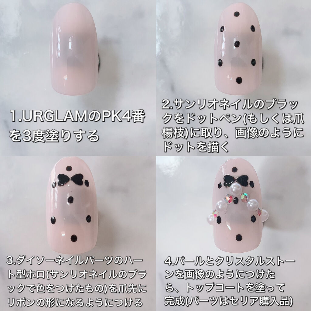 ALL100均♡量産系キルティングネイル🧸……………………………………………………………こんにちは🐷今日は友達からのリクエストで、量産型キルティングネイルを紹介させていただきます!!……………………………………………………………【使用した商品】・UGカラーネイルセレクションPK-4・Seriaネイルパーツ(くま)・CanDoネイルパーツ(ハーフパール、スタッズ)……………………………………………………………《キルティングのやり方(ほんま流です💦)》①好きなカラーを全体に塗る→乾かす②好きなラメのマニキュアを細筆にとり、キルティングの模様になるようにラインをひく(この時、交差する点を先に目印として描いておくと綺麗に描けます!)③ラインが交差した場所に小さめのスタッズを置く④しっかり乾かす⑤ブロックを1つずつトップコートを塗る→これを何度も繰り返す(1回1回しっかり乾かさないと失敗したり、気泡が入ったりします)⑥1つひとつに厚みがでたら完成✨……………………………………………………………今回はALL100均の商品で作成しました💸💰パーツもすごく可愛いので見つけたら是非買ってみてください🧸少し時間がかかるデザインですが、出来上がりはめちゃめちゃ可愛いので是非試してみてほしいです❤……………………………………………………………最後まで読んでくださってありがとうございます💓💞少しでも参考になりましたら、+👤&❤&📎&💬よろしくお願いします!!#セルフネイル#セルフネイルのすゝめ#キルティングネイル#量産型ネイル#ほんまのねいる