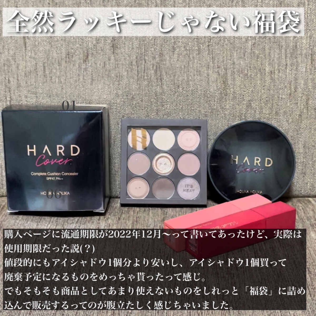2500円の割には内容的にも良いなと思ったのですが、クッションファンデの使用期限がまさかの昨日。 使用期限が今月までなんて書いてたっけ...?と思ったらQoo10には「流通期限が2022年12月〜」 使用期限超えても使えるっちゃ使えるけど、福袋のなかに商品として使用期限1週間以下のアイテムを入れるのって会社的にどうなんだろうって思いました。 ホリカホリカのアイテムは好きな物もあったのですが、私の中での会社としての信用が無くなりました...。