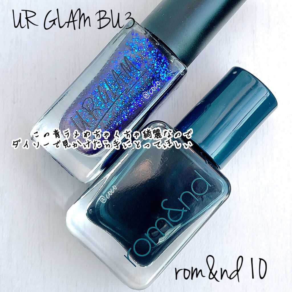 シアーでぬけ感もある他にはない1本💅 ムラ感を楽しむために 写真は2度塗りです✨ 3度塗りだとムラも消えて より深みのある仕上がりに♪ 大好きなURGLAMのBU3の青ラメで キラメキを足しました🙌 発光したような綺麗な青ラメ✨ ダイソーで見かけたら ぜひ手に取ってほしい逸品です◟̽◞̽ ༘*