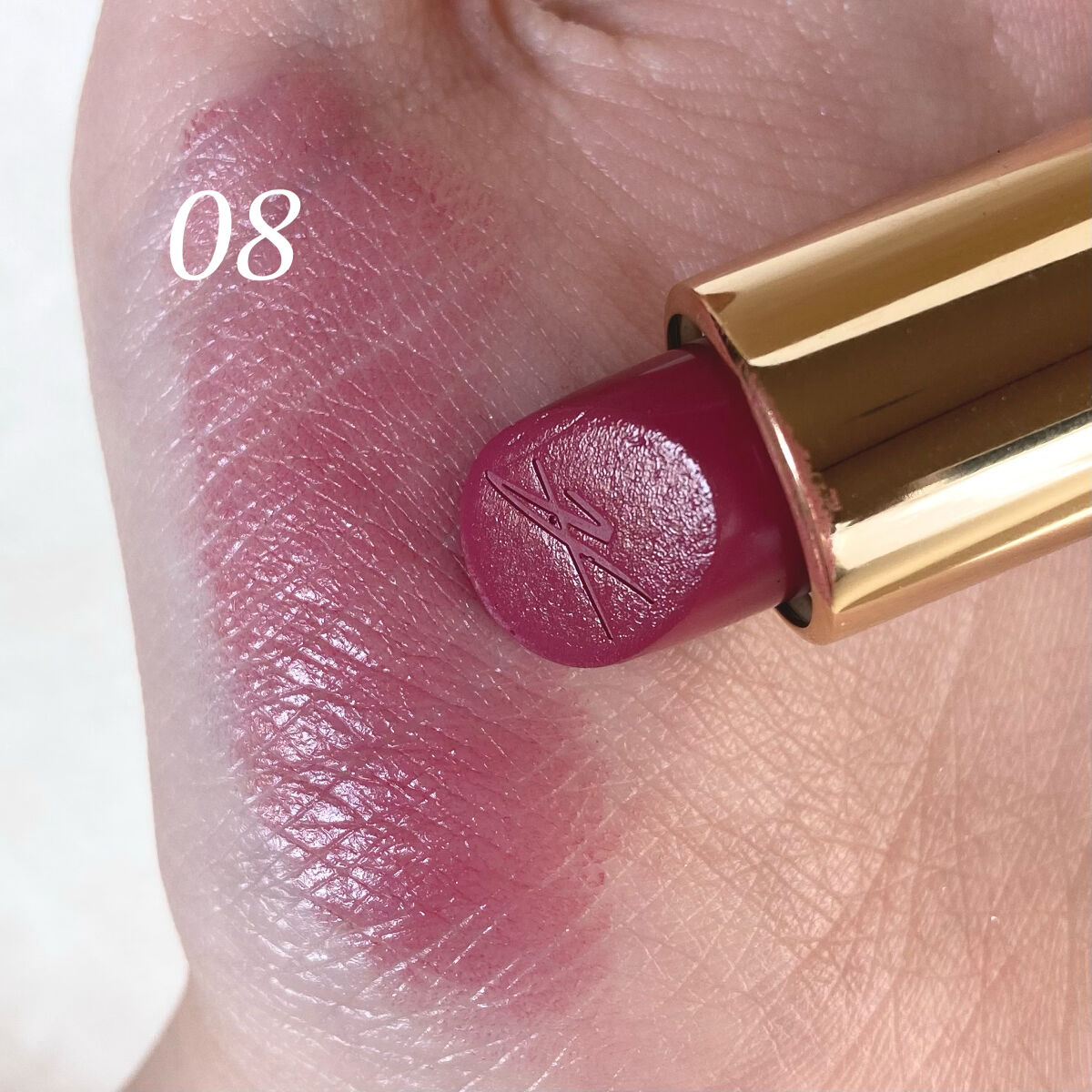 どちらもローズ系ですが、07は少し黄みを感じる明るいローズ、08は全く黄みを感じない青みのローズです🌹どちらも透け感とツヤがあるので、1度塗りならあまり濃く付かず2度以上塗るとしっかり発色します🎀 07は少し黄みがありますがニュートラルめのピンクなので、パーソナルカラーやアイシャドウの色問わずとっても使いやすいと思います! 08は少し深みもあり、重ねると大人っぽい深みローズに発色するので特にブルベさんに似合いやすいと思います。