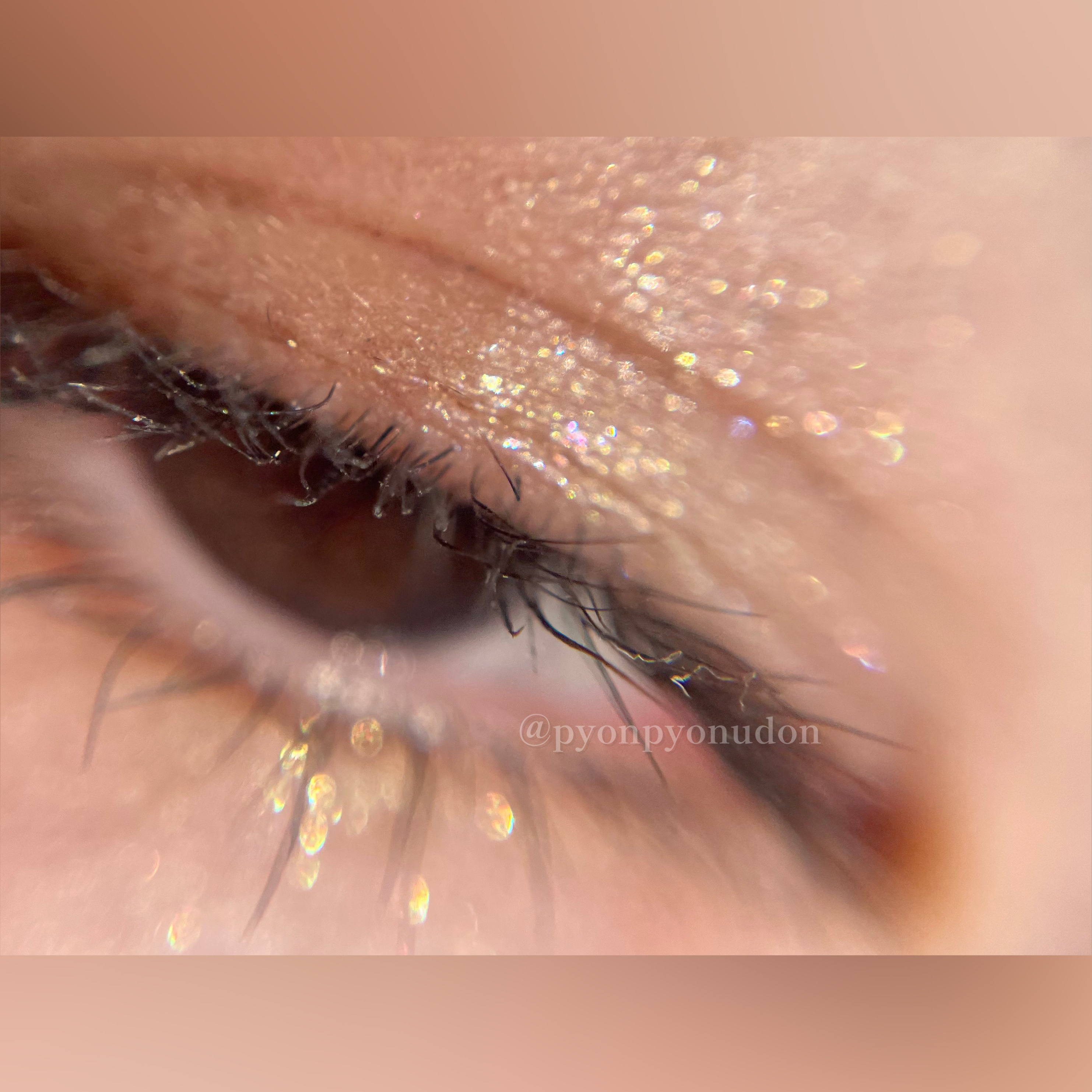 アンプリチュードの過去の限定色がまさかの復刻✨ ブルーブラウンは全色がキラキララメ入りの透け感アイシャドウ👀 個人的に黄色やゴールド系は若干使うのが難しいのですが、ポイント使い(今回は上まぶた真ん中と涙袋真ん中)でキラッと入れるなら使いやすいかも!と思いました〜 とにかくラメ感💓✨なアイシャドウです🥹