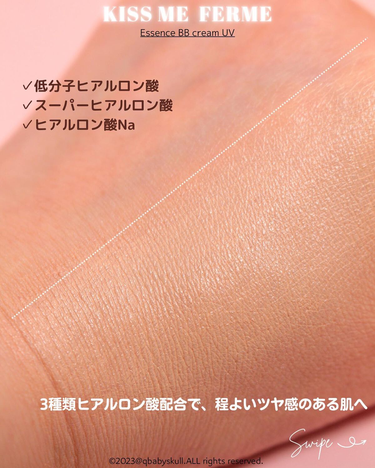 \キスミー フェルムエッセンスBBクリームUV/□ひと塗りでハリ美肌を演出する高カバーのBBクリーム□ピタッと密着してくずれにくい!□うるおう3種のヒアルロン酸◎ハリ感+ポリリフト配合▶︎ニキビ跡や濃いめのしみも自然に隠れるのに厚塗り感はなく...