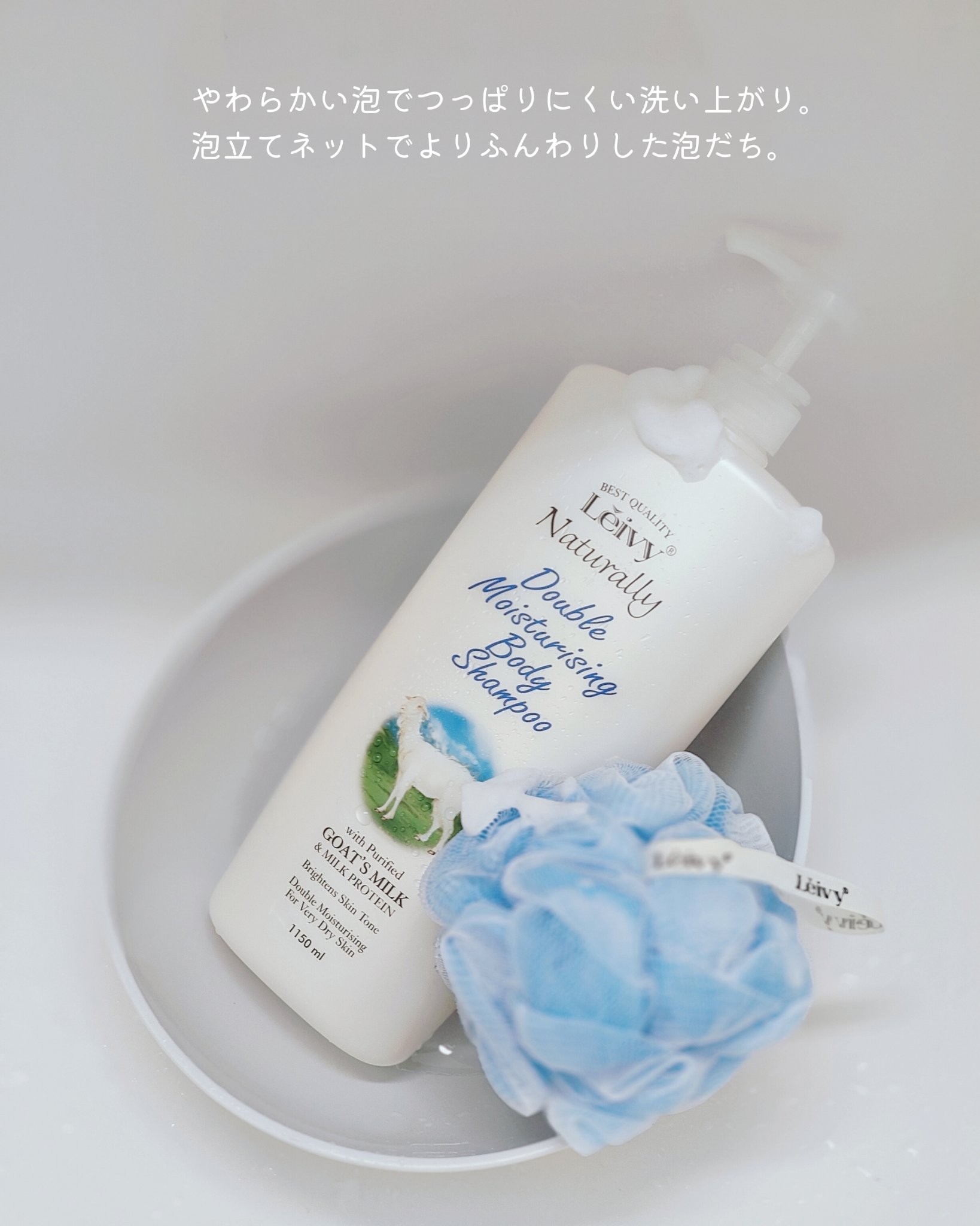 🐑LeivyNaturallyダブルモイスチャーボディシャンプー(※オープン価格)山羊乳とミルク由来成分を使ったボディシャンプーです。やわらかい泡で洗えて、洗い上がりはつっぱりにくいと感じました。パウダリー系のやさしい甘さのある香りで、お風呂...