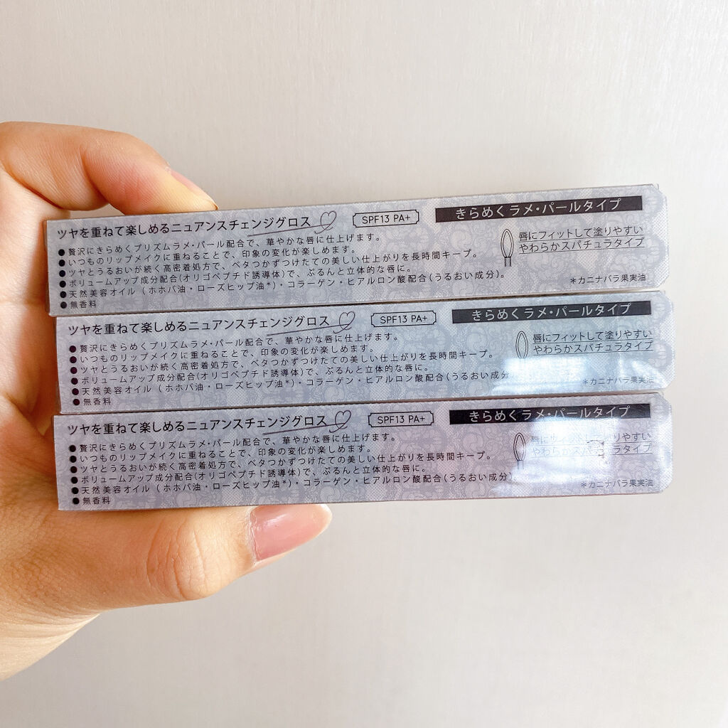- ◇きらめくラメ・パールタイプ 贅沢に輝くプリズムラメ・パール配合で、華やかな唇に。 くちびるで遊ぶ、ニュアンスグロス。 ◆美しい仕上がりを長時間キープ キスさせる唇に 高密着処方で唇のツヤとうるおいが続き、つけたての美しい仕上がりを長時間キープします。 ◆ボリューミィでぷるんとした立体的な唇に ボリュームアップ成分(オリゴペプチド誘導体)配合で、ぷるんと立体的な唇に。 ◆美容液成分配合でうるおう 天然美容オイル(ホホバ油・ローズヒップ油※1)・コラーゲン・ヒアルロン酸(うるおい成分)配合。 ◆使いやすいやわらかスパチュラタイプ 唇にフィットして塗りやすい、やわらかスパチュラタイプのチップを採用。 ◆無香料 SPF13・PA+