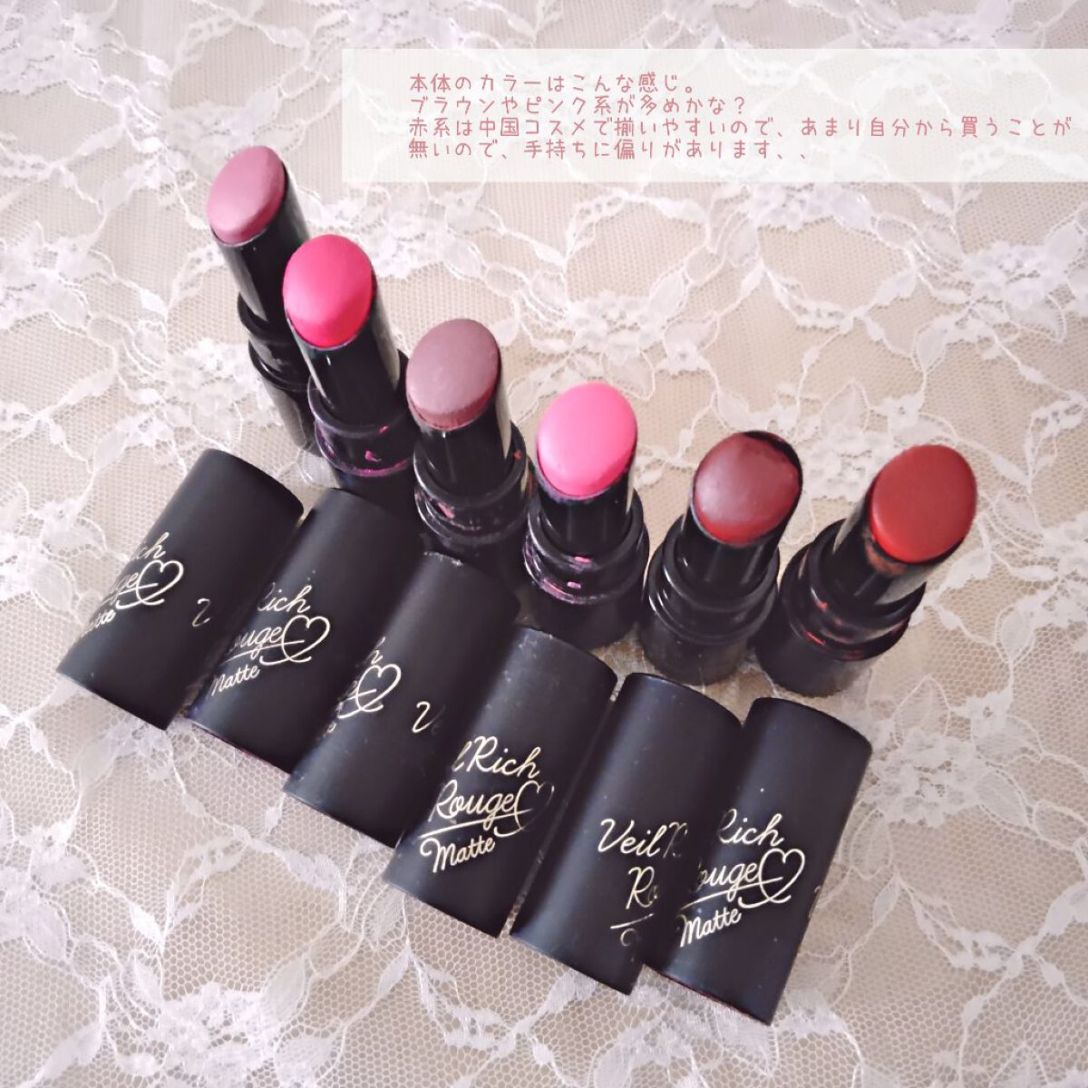 kissのヴェールリッチルージュシリーズ、それぞれマット・グロウと見てきましたが、今回はそのまとめでどちらも合わせて紹介したいと思います♪あくまで手持ちなので、気に入ったカラーやお気に入りだったりですが、少しでも参考になれば幸いです!●マット、グロウそれぞれの特徴 マットは見たままのしっかり発色で、パキッと発色します。しっかり発色するんですが、マスクメイクとの相性は微妙。マスクの擦れに弱く、落ちるというよりは延びてしまい、口以外に広がってしまいます。グロウはシアータイプもありますが、しっかり色付くのは見たまま発色です。しっかりしたツヤが出て、うるおいたっぷりな使い心地。マスクメイクとはマット同様合わないです。こちらは伸びると言うより、普通に落ちます。●各カラーについて(マット) 54DearRose青みが少し強めなモーブピンク。しっかり発色の自己主張がある青みカラー。モーブカラーで上品だが、少し合わせづらさがある。56Gloriaかなりしっかり発色の派手めビビッドピンク。単色使いでパンチの効いたリップメイクに。個人的なおすすめとしては、リップの内側に少し乗せ、グラデ血色感リップに。57BerryChocolate落ち着いたカラーで、上品な色気のあるダークブラウンです。ビターな発色でグッと色気があるリップに仕上がります。ゴールドやピンクの大粒のラメがぎっしり入っているため、独特のキラキラ感が目をひきます。60BewLovable54同様のしっかり発色するピンク。現在は廃盤カラー。赤みが強いピンクなので、54に比べてこちらの方がメイク馴染みは良く使いやすい。63ElegantHighHeelsリップ本体はブラウンに見えるが、こちらはボルドーです。赤み、茶みが強い落ち着いた大人っぽい色気のあるボルドー。少しダークな発色で、赤々しいのではなく、茶色系の赤に、赤を差したようなカラー。X01UrbanSunset2019年の限定色。赤みのあるオレンジブラウンで、レンガのような発色。ハンサムなブラウンカラーで女性らしさもありつつカジュアルな大人っぽい仕上がり。特に私のお気に入りなカラーは57、限定01です。どちらもブラウンリップですが、対照的な印象に仕上がるリップです。57は大人っぽく落ち着いた、エレガントでダークなリップに、限定01はレンガブラウンで都会的なカジュアルに、それぞれ仕上がります。(グロウ)01Mandarinuマンダリンオレンジ。華やかなオレンジで夏らしさ、大人っぽさをすこーしブラウンを加えたような落ち着きのあるカラー。02MoodBerry青みの強い少し暗めのローズピンク。青みが強めで、グロウ03よりやや暗めのトーンで発色するローズピンク。03Gracefully王道ピュアピンク。少しヌーディーな色味でしっかり発色、ツヤ感があります。普段使いしやすい色味で、発色は良いのに肌馴染みする使いやすい万能ピンク。06Reinetteほんのり発色のシアーピンクに、ゴールドや偏光のカラフルなラメが沢山入ったつやぷるな仕上がりに。単体だとほんのり血色感が出て、ナチュラルなのにラメが輝く華やかな仕上がりに。カラーチェンジや重ね塗りにも。07CherryParty目を引く派手めピンクに、金属風のギラギラピンクラメがたっぷり入ったチェリーピンク。ビビッドな発色で、インパクトあるリップに仕上がる。ティントじゃないけど、色が残りやすい。09PinkPrism青みピンクに、ブルーの偏光パールが入ったカラー。偏光パールが見る角度でピンクだったり、紫だったりで、色が変化して見える宇宙のようなリップ。紫がかって見えるので、メイクによっては顔色が少し悪く見える。10MysteriousShineやや暗めのシアーブラウン。赤みのあるブラウンでほんのり色づきつつ、キラキラのラメが輝く、透明感溢れるカラー。細かいピンクやシルバー、ブルーなどのラメがたっぷり入っているので、つやキラな仕上がり。X02WarmBeige2019年春限定品。少しピンク味のあるナチュラルなウォームベージュで、肌に馴染みやすく、使いやすいです。暖かみのあるベージュがしっかり発色しますが、ナチュラルなカラー過ぎてさっぱりした印象。メイクで足し引きして使うと◎ヌーディーな上品カラーで場所を選ばず使えます。X03BitterFramboise2020年のバレンタインシーズンに限定発売されたものになります。大人っぽさのあるくすみローズピンク。落ち着いた大人っぽい印象のあるリップに仕上がり、メイク馴染みも良く、上品なかわいらしさがあります。X04BitterFig2020年のバレンタインシーズンに限定発売されたものになります。赤みが強めな、チョコレートのようなブラウンに発色して、色気たっぷりに艶やかに発色します。ちょうど良い赤みブラウンで、メイクにも合わせやすく、使いやすいです。特に私のお気に入りなカラーは01、06、07、限定04です。01は華やかなオレンジブラウンがカジュアルにもキレイめにも使えるので気に入ってます。06はニュアンスチェンジやナチュラルメイクにさっと使いやすい。07は夏に使いたいド派手リップです。派手なんだけどツヤ感が