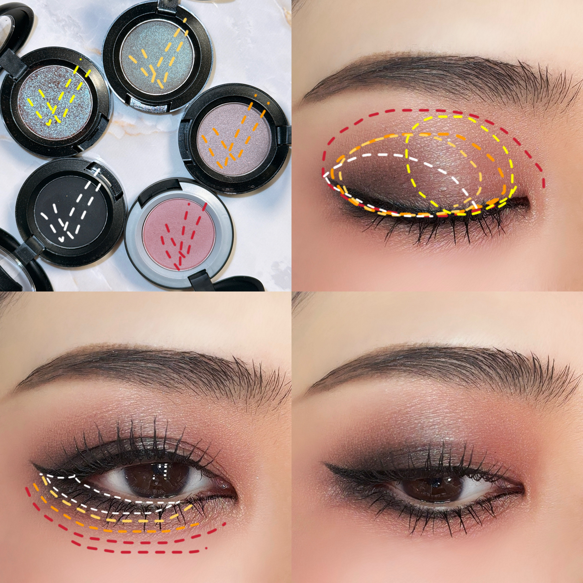 MACのシングルアイシャドウを組み合わせた彩度低めなくすみカラーメイク🥀🖤🖤使用カラーはスモールアイシャドウ【スターリーナイト】【クラブ】【シェール】【カーボン】、パウダーキスアイシャドウ【ライプンド】の5色❣️シェールとカーボンの組み合わせ...