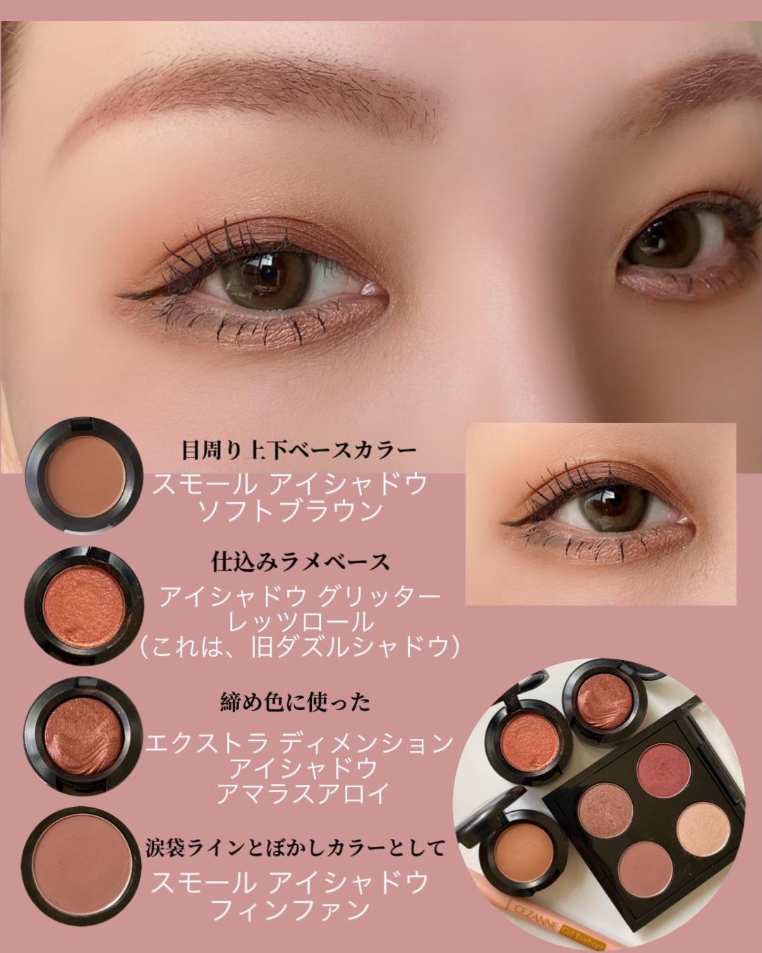 MACスモールアイシャドウ#ソフトブラウン#スウィートラスト#ピンクヴィーナス#レフトユーオンレッドスウィートラストをまぶた全体に。ソフトブラウンで彫りを作ってから、レフトユーオンレッドを二重幅よりちょっと広めに。最後にまぶたの中央にピンクヴ...